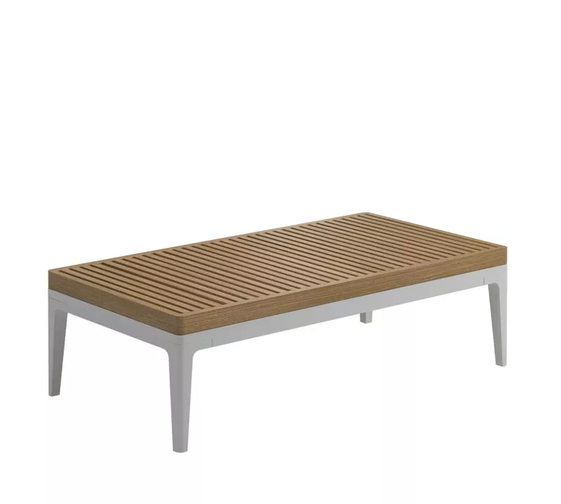 Loungetisch Grid von Gloster mit einem pulverbeschichteten Aluminiumgestell und Teakholz oder Keramik Tischplatte.