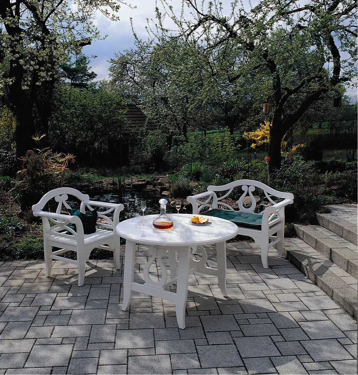 Herrenhaus Michelle Gartentisch Ø 110 cm Gartentisch Michelle von Herrenhaus, komplett aus hochwertigstem afrikanischen Tola-Holz gefertigt. Das Holz des Tola-Baumes weist einen hohen Gehalt an Harzen und Ölen auf und ist damit hervorragend gegen Verwitterung gewappnet. Es hat eine sehr homogene Struktur und lässt sich gut verarbeiten. Das sind wichtige Faktoren, wenn man - wie bei Herrenhaus - noch traditionelle Techniken des Schreinerhandwerks einsetzt. Aus ökologischer Überzeugung verwendet Herrenhaus nur Holz aus Nutzholzbeständen, deren Wiederaufforstung sichergestellt ist. Massives Tola-Holz Weiß lackiert UV-beständig Maße (Ø × H) 110 × 74 cm