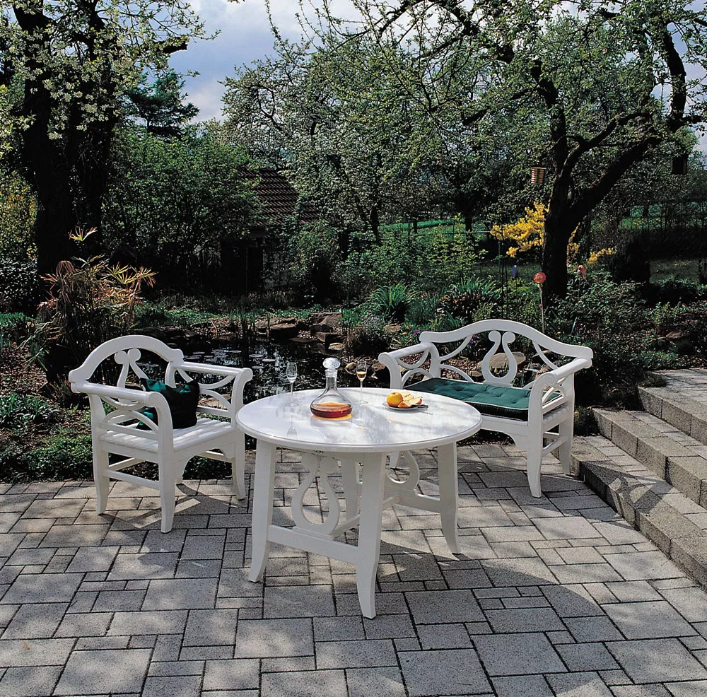 Herrenhaus Nicole Gartentisch Ø 110 cm Gartentisch Nicole von Herrenhaus, komplett aus hochwertigstem afrikanischen Tola-Holz gefertigt. Das Holz des Tola-Baumes weist einen hohen Gehalt an Harzen und Ölen auf und ist damit hervorragend gegen Verwitterung gewappnet. Es hat eine sehr homogene Struktur und lässt sich gut verarbeiten. Das sind wichtige Faktoren, wenn man - wie bei Herrenhaus - noch traditionelle Techniken des Schreinerhandwerks einsetzt. Aus ökologischer Überzeugung verwendet Herrenhaus nur Holz aus Nutzholzbeständen, deren Wiederaufforstung sichergestellt ist. Massives Tola-Holz Weiß lackiert UV-beständig Maße (Ø × H) 110 × 74 cm
