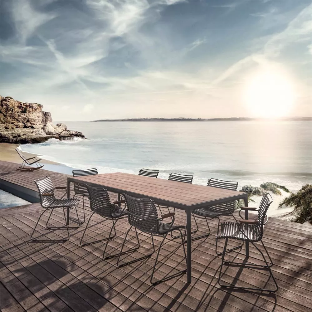 Houe Four Gartentisch • Outdoor Esstisch mit pulverbeschichtetem Aluminiumgestell Die Outdoor Gartentische Houe Four, entworfen von dem Designer Henrik Pedersen, lassen sich vielfältig mit Click Gartenstühlen kombinieren und bilden zusammen eine hochwertige Essgruppe auf Ihrer Terrasse oder im Garten. Das robuste, pulverbeschichtete Aluminiumgestell der Four Kollektion ist mit einem speziell entwickelten Strangpressprofil hergestellt. Die Tischplatte besteht aus gepressten Bambusholzlatten, die besonders pflegeleicht und resistent gegen Feuchtigkeit sind. Die originelle und komfortable Four Gartenmöbel schafft eine leichte, lockere und dennoch hochwertige Atmosphäre. Die klare Formen faszinieren durch eine organische, hochwertige Gestaltung. Der hervorragende Sitzkomfort macht die Four Essgruppe schnell zum Liebling in Ihrem Garten. Aluminiumgestell pulverbeschichtetTischplatte aus Bambusholz, belattetLeicht zu reinigenGanzjährig wetterfest Maße: (B × T × H) 210 × 90 × 74 cm