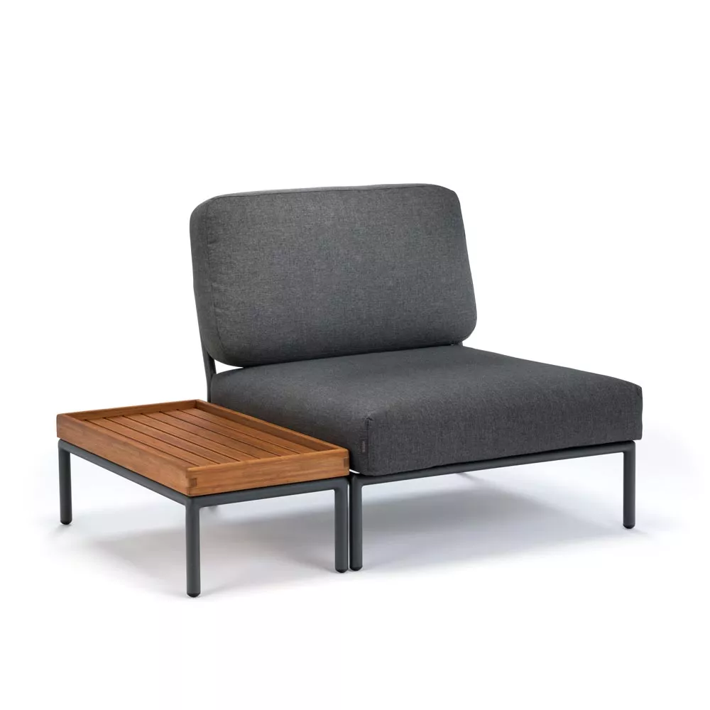 Houe Loungesofa • Gartensofa Modul links (Armlehne sitzend rechts) mit pulverbeschichtetem Aluminiumgestell Die neue Outdoor Loungekollektion Houe Level, entworfen von dem Designer Henrik Pedersen, lässt sich vielfältig kombinieren und bildet aus modulierbaren Elementen eine hochwertige Loungegruppe auf Ihrer Terrasse oder im Garten. Das robuste Gestell der Level Kollektion besteht aus pulverbeschichtetem Aluminium, die Tischplatte ist aus Bambusholzlatten gefertigt und mit einem erhöhten Rand versehen. Wasser abweisende Kissen aus dunkelgrauem Stoff machen die Loungeecke besonders pflegeleicht und bequem. Die originelle und komfortable Level Gartenmöbel schafft eine leichte, lockere und dennoch hochwertige Atmosphäre. Die fließenden Übergänge der LoungeModule faszinieren durch eine organische, hochwertige Gestaltung. Der hervorragende Sitzkomfort macht die Loungegruppe schnell zum Liebling in Ihrem Garten. Aluminiumgestell pulverbeschichtet Wasserabweisende Kissen Leicht zu reinigen Ganzjährig wetterfest Maße: (B × T × H) 140 × 95 × 84 cm