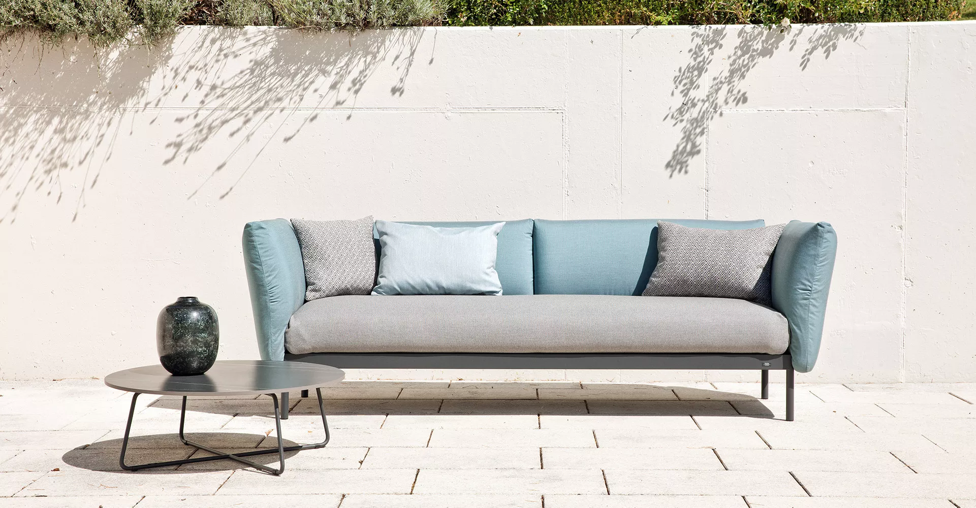 Mit der Kairos Lounge ist ein hohes Maß an Flexibilität möglich. Rücken- und Armlehnteile können individuell angebaut werden. Die einzelnen Sitzelemente werden einfach zusammengestellt, schon ist die faszinierende Outdoor Lounge fertig. Die hochwertige, innovative Polsterung bietet ein besonderes Wohlfühlerlebnis dank eines völlig neu entwickelten Rückens für einen weichen kopfkissen- artigen Anlehnkomfort. Neu im Outdoorbereich ist auch der besondere Polsteraufbau im Sitz. Dank flexibler Bänder und hochwertigem Möbelschaum wird ein punktuell weicher und dennoch fester Sitzkomfort erreicht. Bei Kairos kann auch auf feste Rücken- und Seitenteile verzichtet werden. Wer es luftig - leicht möchte kann als Rückenstütze auch die Rückenrollen wählen und diese nach Bedarf flexibel verwenden. Auch kann mit diesen Rollen einen moderne Farbgestaltung gewählt werden. Die wetterbeständigen Outdoor Stoffe können beruhigt im Freien bleiben. Ablageflächen und Beistelltisch sind aus hochwertigem Teakholz oder hochwertigen Keramikplatten.