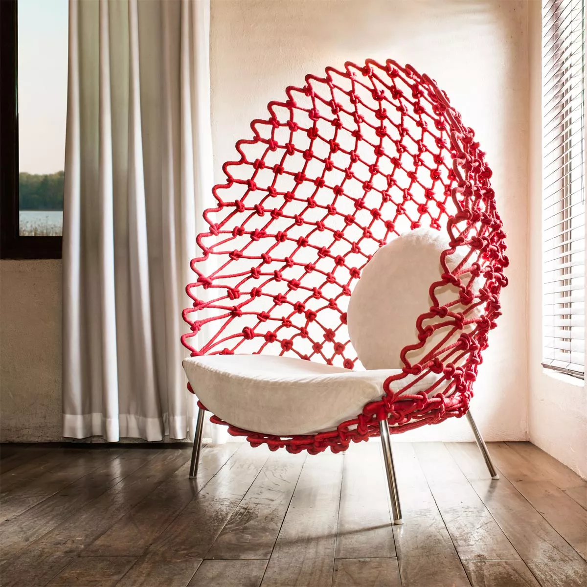 Inspiriert von Fischernetzen und aus Stoff, der um ein Stahlgestell gewickelt und gewickelt ist, umgibt Sie der Dragnet Lounge Chair wie ein Kokon. Kenneth Cobonpue Dragnet ist eine moderne Kollektion, die sich perfekt für Innen- und Außenbereiche eignet. Die moderne Form des Sessels macht sie ideal zum Zurücklehnen. Der von Federica Capitani entworfene dünne, mit Kunststoffgeflecht bezogene Stahlrahmen unterstreicht das moderne Design der Forma. Das Synthetikgeflecht ist besonders widerstandsfähig gegenüber Hitze, Regen, Eis, Schnee und UV-Strahlung.