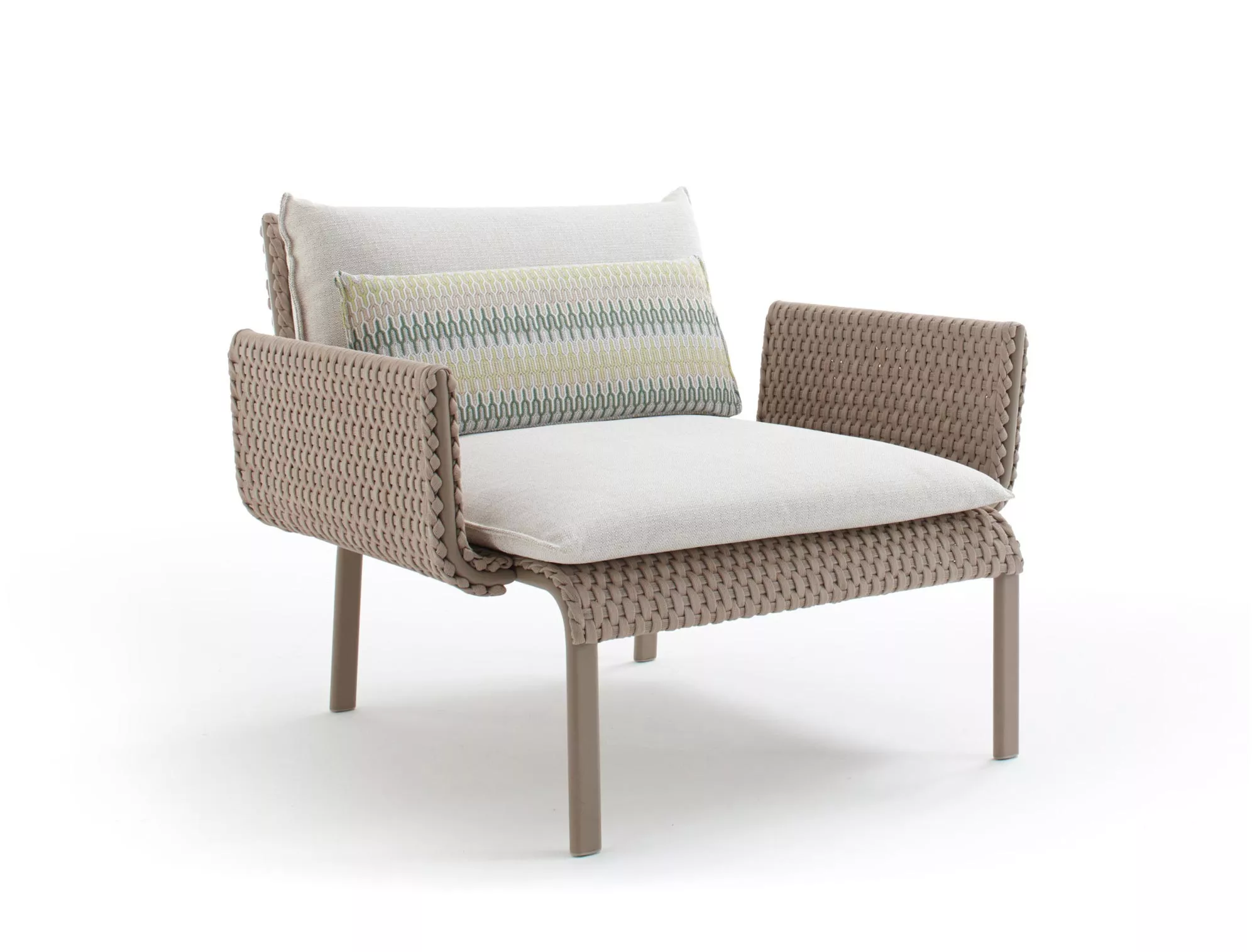 Hergestellt mit pulverbeschichtetem Aluminiumgestell, bespannt mit Sunrope Kunststoffgeflecht. Wertvolle Materialien und moderne Silhouetten machen diese Kollektion einzigartig und luxuriös. Der gemütliche Sitz sorgt für den vollkommenen Komfort, die dynamischen Formen erlauben es, mit den umgebenden Räumen zu spielen und sie zu ergänzen. Alle Key West Möbelstücke sind modular aufgebaut. Perfekt geeignet für die Innen- und Außeneinrichtung von Wohn- und Objektprojekten