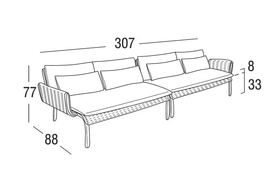 Roberti Key West Outdoor Gartensofa / Loungesofa 307 × 152 cm Hergestellt mit pulverbeschichtetem Aluminiumgestell, bespannt mit Sunrope Kunststoffgeflecht. Wertvolle Materialien und moderne Silhouetten machen diese Kollektion einzigartig und luxuriös. Der gemütliche Sitz sorgt für den vollkommenen Komfort, die dynamischen Formen erlauben es, mit den umgebenden Räumen zu spielen und sie zu ergänzen. Alle Key West Möbelstücke sind modular aufgebaut. Perfekt geeignet für die Innen- und Außeneinrichtung von Wohn- und Objektprojekten Die Key West Kollektion bietet unbegrenzte Lösungen für die Gestaltung und Ausstattung Ihrer Terrasse mit Gartenmöbel, die Schaffung von verschiedenen Outdoor Loungegruppen, Treffpunkten, die unabhängig voneinander oder mit Irokoholzbalken verbunden sind. Die massiven Doppelbalken sind mit speziellen Füßen versehen, um sie vom Boden abgehoben zu halten, einen langen Kontakt mit Wasser zu vermeiden und die Qualität zu schützen. Die wärmebehandelten Irokoholzdoppelbalken sind eine exklusive und vielseitige Ergänzung der Kollektion und können als Trennwand zwischen zwei großen Außenbereichen oder als Basis für Sofas und Relaxbereiche, bzw. als Bänke verwendet werden. Die verschiedenen Elemente können leicht und schnell montiert, entfernt, getrennt und wieder, unbegrenzt kombiniert, eingefügt werden. Key West - eine ideale Konstruktion, die interessanten Möglichkeiten bietet die Räume zu strukturieren und sie mit den verschiedenen Modulen zu kombinieren. Sitzmöbel mit Aluminiumgestell pulverbeschichtet, bespannt mit Sunrope cipria Kunststoffgeflecht zeichnet Eleganz und Schlichtheit der Formen aus. Die stapelbaren Stühle eignen sich perfekt für die Objektausstattung, sie sind praktisch, bequem und robust. Das Key West Design strahlt eine unverwechselbare Eleganz, einen Ausdruck der Freude am Leben in einem komfortablen und glamourösen Raum aus, verleiht Ihrem Garten eine unverwechselbare, persönliche Note. Key West ist eine elegante Outdoor-Möbelkollektion, die von architektonischem Charakter geprägt ist und zeitlose Schönheit und Harmonie ausstrahlt. Alle Teile der Kollektion integrieren sich optimal in jede Umgebung und tragen dazu bei, dass wir das Leben im Freien mit Eleganz und Natürlichkeit genießen können, wo auch immer wir uns aufhalten. Die Roberti Lounge Kollektion Key West ist aus jeder Perspektive ein Blickfang. Die stilsicheren Linien und elegante Lounge Atmosphäre passen perfekt in jeden Wohnraum und laden zur Gastlichkeit ein. Gestell: Aluminium pulverbeschichtet Geflecht: Sunrope Leicht zu reinigen Wetterfest Maße: (B × T × H) 307 × 152,5 × 77 cm