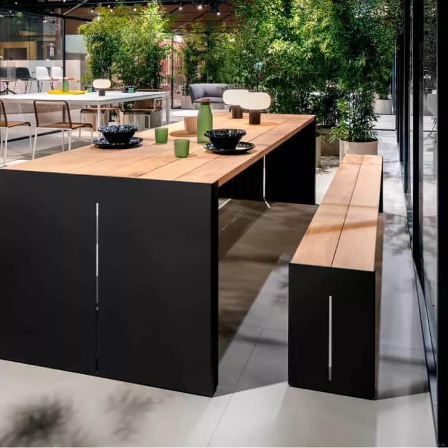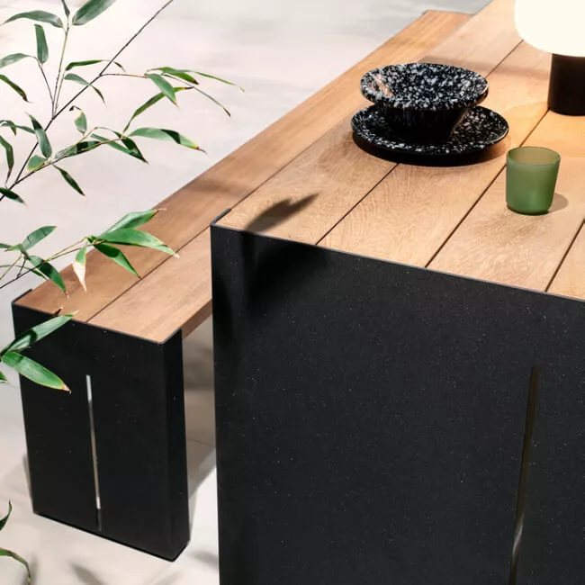 Die Größe des Tisches ändert sich jedoch und damit auch dessen Funktionalität. Die Oberplatte ist breiter (von 50 auf 90 cm) und eine Bank aus denselben Materialien kann in der niedrigsten Version des PANCO (74 cm) bequem untergebracht werden. Ein fester und komfortabler Gegenstand, der die Kollektion vervollständigt und deren geselligen Geist weiter bestimmt. Nüchtern und funktional verschwindet der Sitz elegant unter dem Tisch, wobei die Harmonie des Ganzen erhöht wird. Mit dem unverwechselbaren Stil von Lapalma kann man entzückende Abende im Freien auf einer Terrasse oder im Garten verbringen, sowie auch Außenräume öffentlicher Sammelstellen wie Museen und Galerien einrichten.