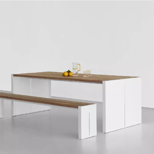 Das Tischsystem PANCO, das ein Ambiente je nach seinen räumlichen Bedürfnissen organisiert, wird heute von Romano Marcato an die Anforderungen des Outdoor-Designs angepasst. In der Outdoor-Version bleibt das kennzeichnende Element, das die absolute Originalität und die elegante Dynamik des ursprünglichen Designs festlegt, unverändert: und zwar das Detail der Seitenbeine, die aus gefalteten Metallplatten mit vertikalem Schlitz bestehen. Die Materialbegegnung zwischen Stahl und Holz wird ebenfalls erneuert. Die Beine aus pulverbeschichtetem Metall, entweder in weißen oder schwarzen Tönen erhältlich, kombinieren sich mit einer Tischplatte aus warmem und widerstandsfähigem Iroko.