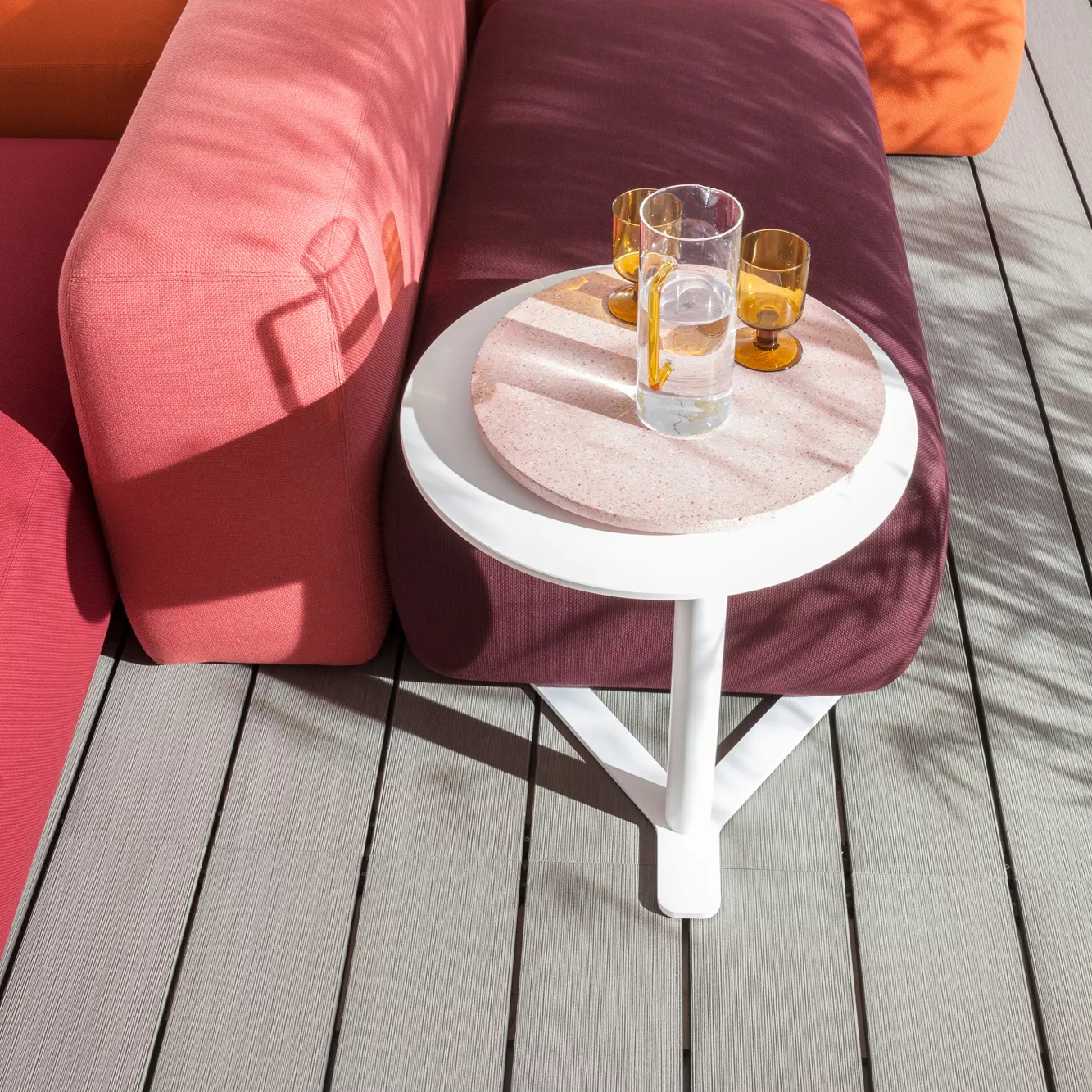 Die Sitz- und Armlehnenelemente sind aus feuerhemmendem Polyurethan-Polsterschaum mit differenzierter Materialdichte und einer Schutzschicht aus wasserabweisendem, luftdurchlässigem Material. Der Bezug aus UV-resistentem Outdoorstoff ist abziehbar.