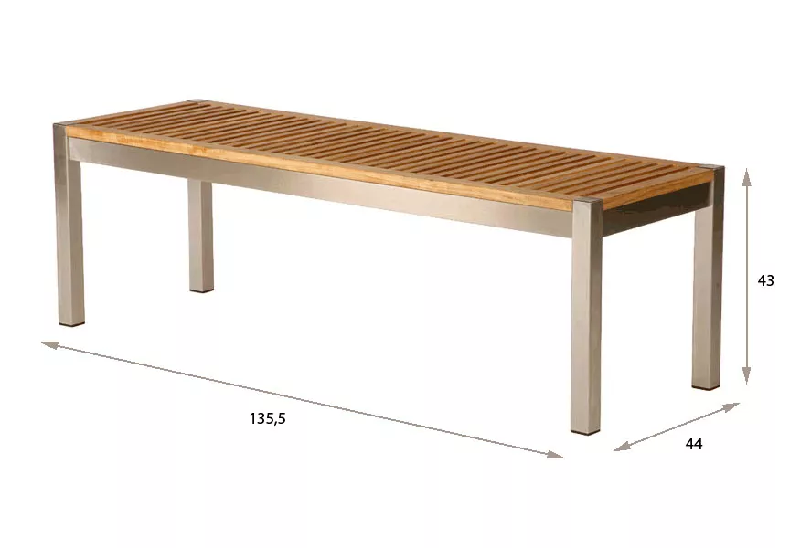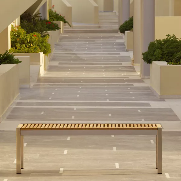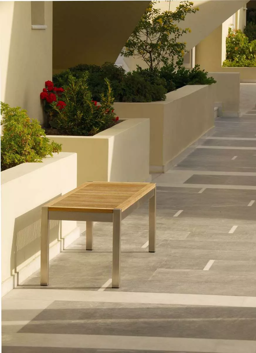 Ein Gestell aus Edelstahl und Sitzfläche aus hochwertigem Teakholz zeichnen diese lehnenlose Bank von Barlow Tyrie aus.
