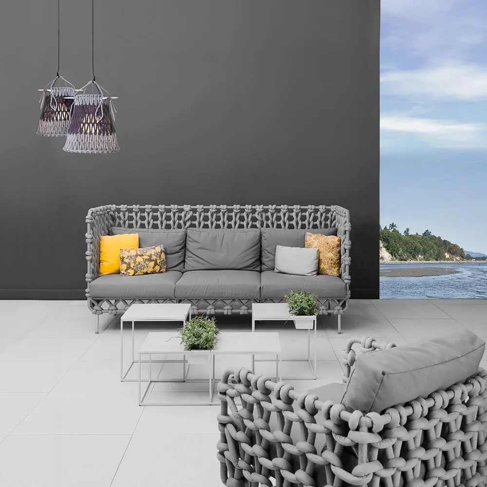 Kenneth Cobonpue Loungesofa Cabaret Kenneth Cobonpue Cabaret Gartensofa mit Synthetikgeflecht, aufgespannt auf einem Metallgestell sorgt für einen angenehmes Sitzerlebnis. Die Cabaret Kollektion wird von der Einfachheit und subtilen Schönheit der Kunst des Strickens inspiriert. Das weiche Geflecht aus stoffumwickeltem Schaum, aufgezogen auf einem Stahlrahmen, wirkt originell und modern. Es ist besonders widerstandsfähig gegenüber Hitze, Regen und UV-Strahlung. Die abgerundete Lounge Elemente der Cabaret Kollektion strahlen Komfort und Gemütlichkeit aus. Das transparente Design verleiht der Eindruck in der Luft zu schweben. Die besonders leichte Silhouette definiert die Cabaret Kollektion. Die Loungegruppe wirft einen schönen, dekorativen Schatten während die Sonne auf- und untergeht. Synthetikgeflecht Wetterbeständig Leicht zu reinigen Maße (B × T × H)214 × 78 × 100 cm