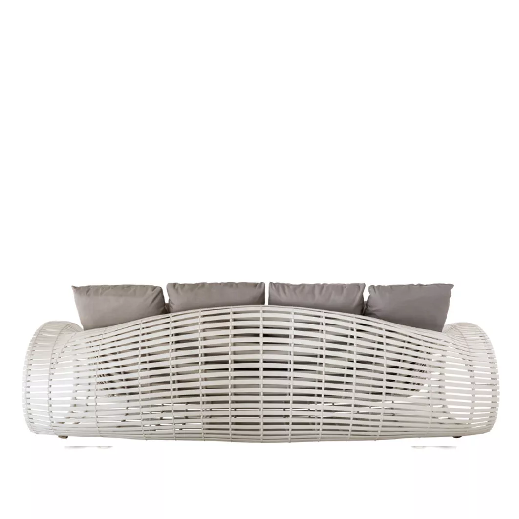 Loungesofa Lolah Capsule inkl. 3 Rückenkissen 51 × 51 cm • 3 Dekokissen 49 x 33 cm Loungesessel Capsule Lolah von Kenneth Cobonpue mit einem Gestell aus Aluminium / Polyrattan Kenneth Cobonpue Lolah verbindet traditionelle Bootsbau Technik mit modernem Design. Diese Outdoor Kollektion zeichet sich durch die Flexibilität des Materials und eine Vielzahl von sinnlichen Kurven mit stilvollen Oberflächen in braun bzw. whitewash aus. Lolah präsentiert mit seiner sinnlichen Form, Materialökonomie und strukturellen Schönheit eine Loungegruppe der Luxusklasse. Die abgerundete Elemente der Lolah Kollektion strahlen Komfort und Gemütlichkeit aus. Das transparente Design verleiht den Eindruck in der Luft zu schweben. Die besonders leichte Silhouette definiert die Lolah Gartenmöbel. Das Kunstoffgestell wirft einen schönen, dekorativen Schatten während die Sonne auf- und untergeht. Das Synthetikgeflecht ist besonders widerstandsfähig gegenüber Hitze, Regen, Eis, Schnee und UV-Strahlung. Polyethylene, Nylon, Aluminum Wetterbeständig Leicht zu reinigen Inkl. Sitzpolster 103 x 113,5 x 220