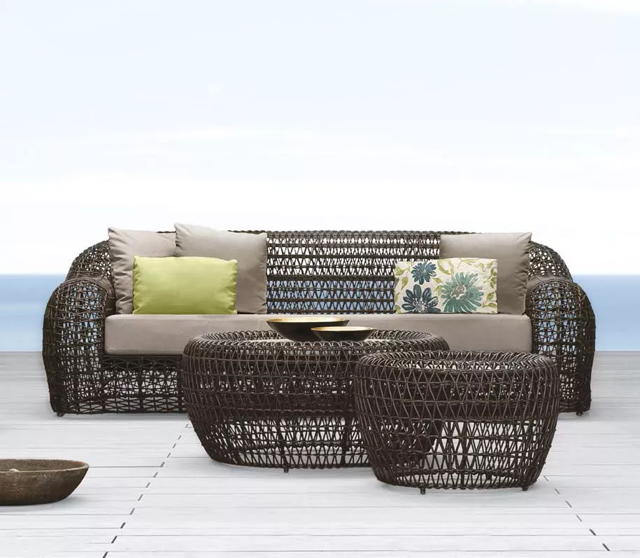 Kenneth Cobonpue Loungesofa BalouGartensofa Balou inkl. Sitzkissen + 2 Stück Rückenkissen 49 × 33 cm + 3 Stück Rückenkissen 51 × 51 cm Kenneth Cobonpue Balou Gartensofa 227 cm mit Synthetikgeflecht, aufgespannt auf einem Metallgestell sorgt für einen angenehmes Sitzerlebnis. Die abgerundete Lounge Elemente der Balou Kollektion strahlen Komfort und Gemütlichkeit aus. Das transparente Design verleiht den Eindruck in der Luft zu schweben. Die besonders leichte Silhouette definiert die Balou Kollektion. Das Kunstoffgeflecht wirft einen schönen, dekorativen Schatten während die Sonne auf- und untergeht. Loungesofa Balou von Kenneth Cobonpue mit Synthetikgeflecht und einem Gestell aus Stahl. Das Synthetikgeflecht ist besonders widerstandsfähig gegenüber Hitze, Regen, Eis, Schnee und UV-Strahlung. Synthetikgeflecht Wetterbeständig Leicht zu reinigen Maße (B × T × H)227 × 105 × 75 cm