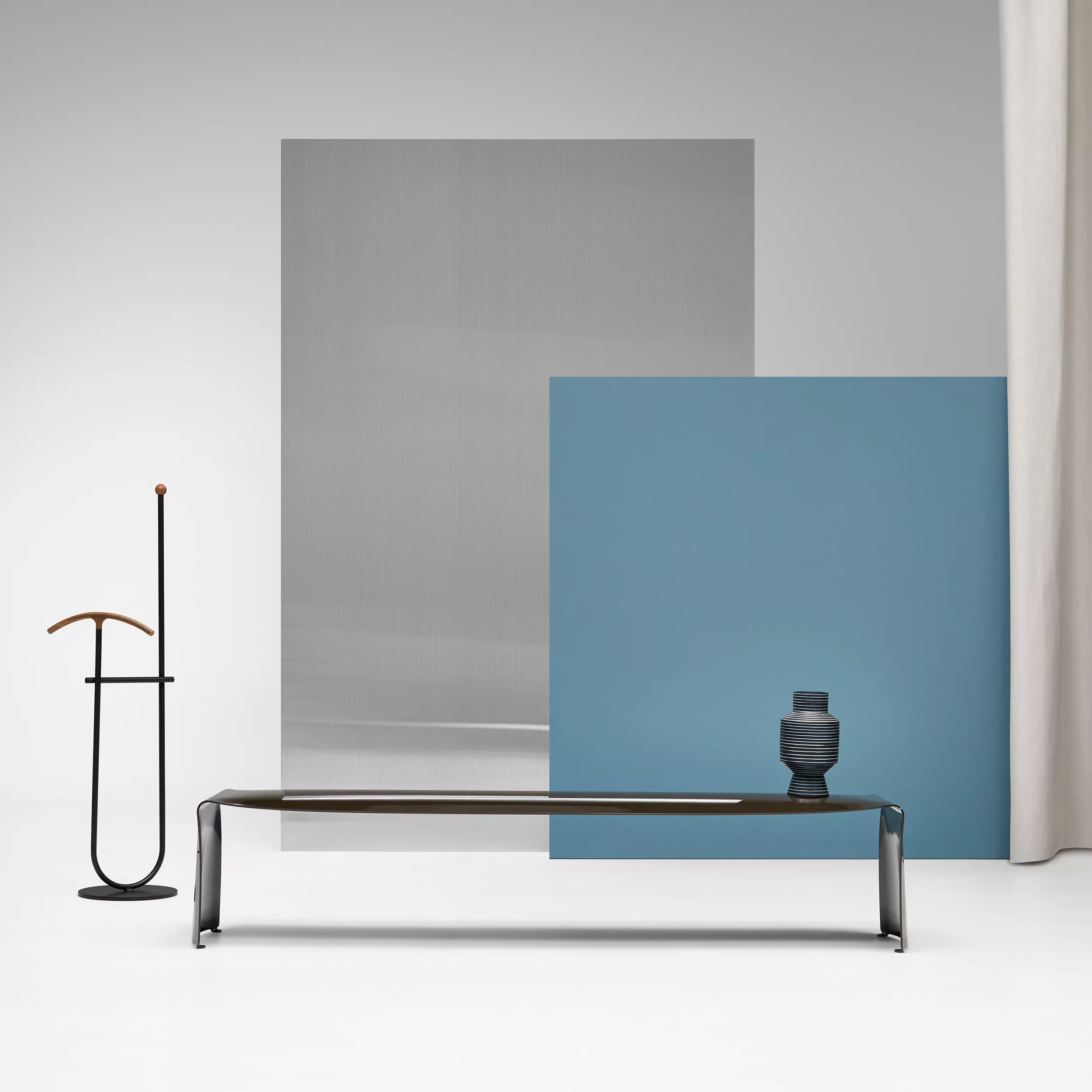Eine Ikone des Leichtgewichts und der Schlankheit, die sowohl in Privatwohnungen als auch in Museen, öffentlichen Gärten, Warteräumen und Gemeinschaftseinrichtungen Platz findet. Innen- und Außenräume, also für diese Bank mit einer Aluminiumseele, deren starke Persönlichkeit auf die außergewöhnliche Flexibilität dieses Materials zurückzuführen ist. Eine Bank, die ein Gefühl von Kontinuität und Kompaktheit vermittelt, da sie entweder aus einem einzigen gebogenen, lackierten Aluminiumblech oder aus glänzend lackiertem Blech in Weiß, Rot oder in der neuen Ausführung Black Coffee besteht. Was am meisten auffällt, ist das Blech: nur 6 mm dick! Mit dieser Kreation hat Xavier Lust auf brillante und originelle Weise Design, Material und Funktion harmonisch vereint.