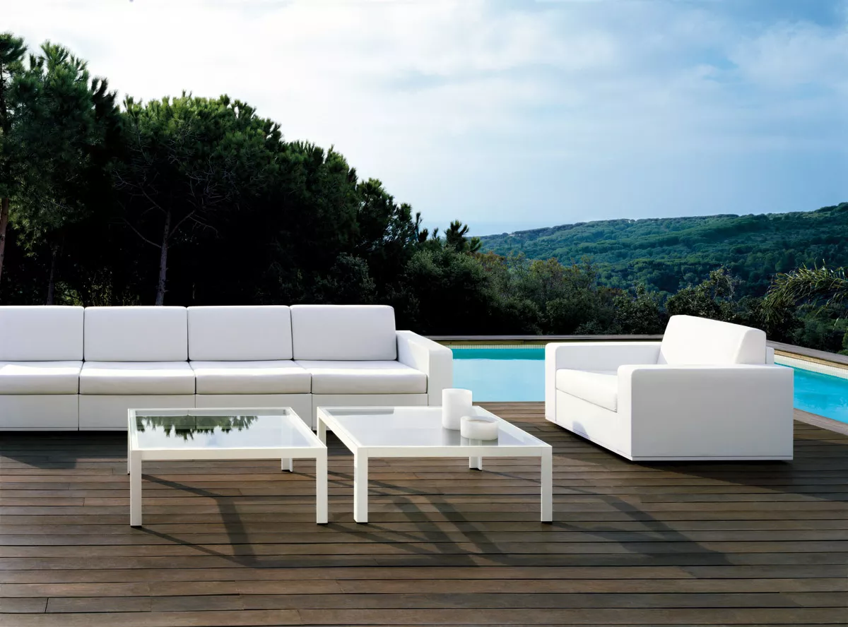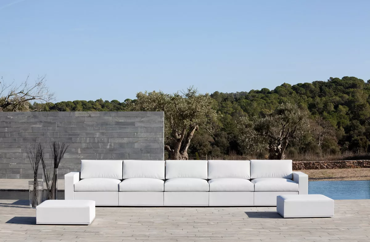 Modular system of sofas, armchair and deckchair suitable for outside and manufactured with the Screen Cover system, exclusive from Bivaq. By this system, upholsterd furniture has been developed with the features necesary for using it outdoors. Sofa structure made of aluminium tube covered with vinytex fabric. Acrylic fabric: 100% solution dyed acrylic, UV resistance (class. 7/8) with stain and water repellent finish. Washable at 30ºC. Open air drying. Vinytex fabric: synthetic fabric made of plastic coated polyester. Incorporate a waterproof layer. UV resistance (class. 7/8). It is recommended to clean it with neutral soap diluted in large quantity of water.