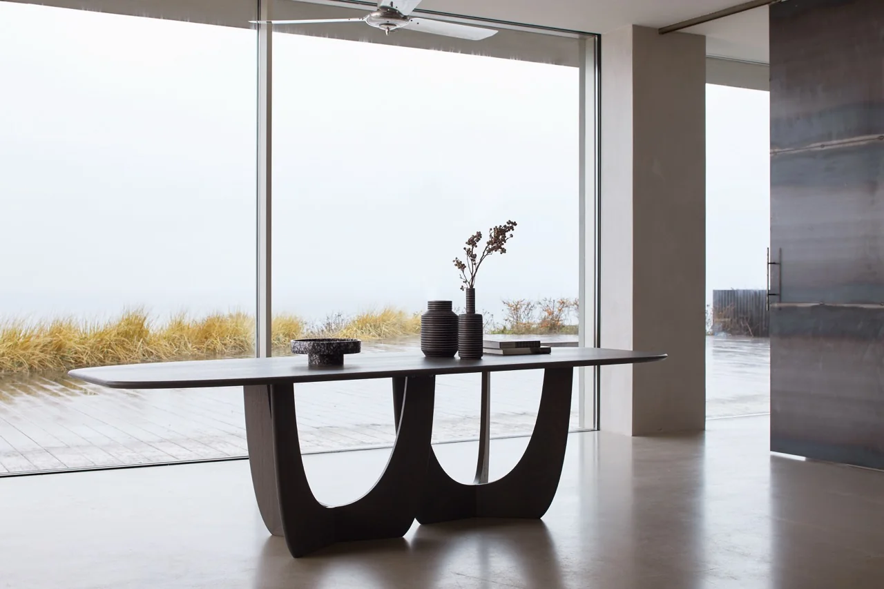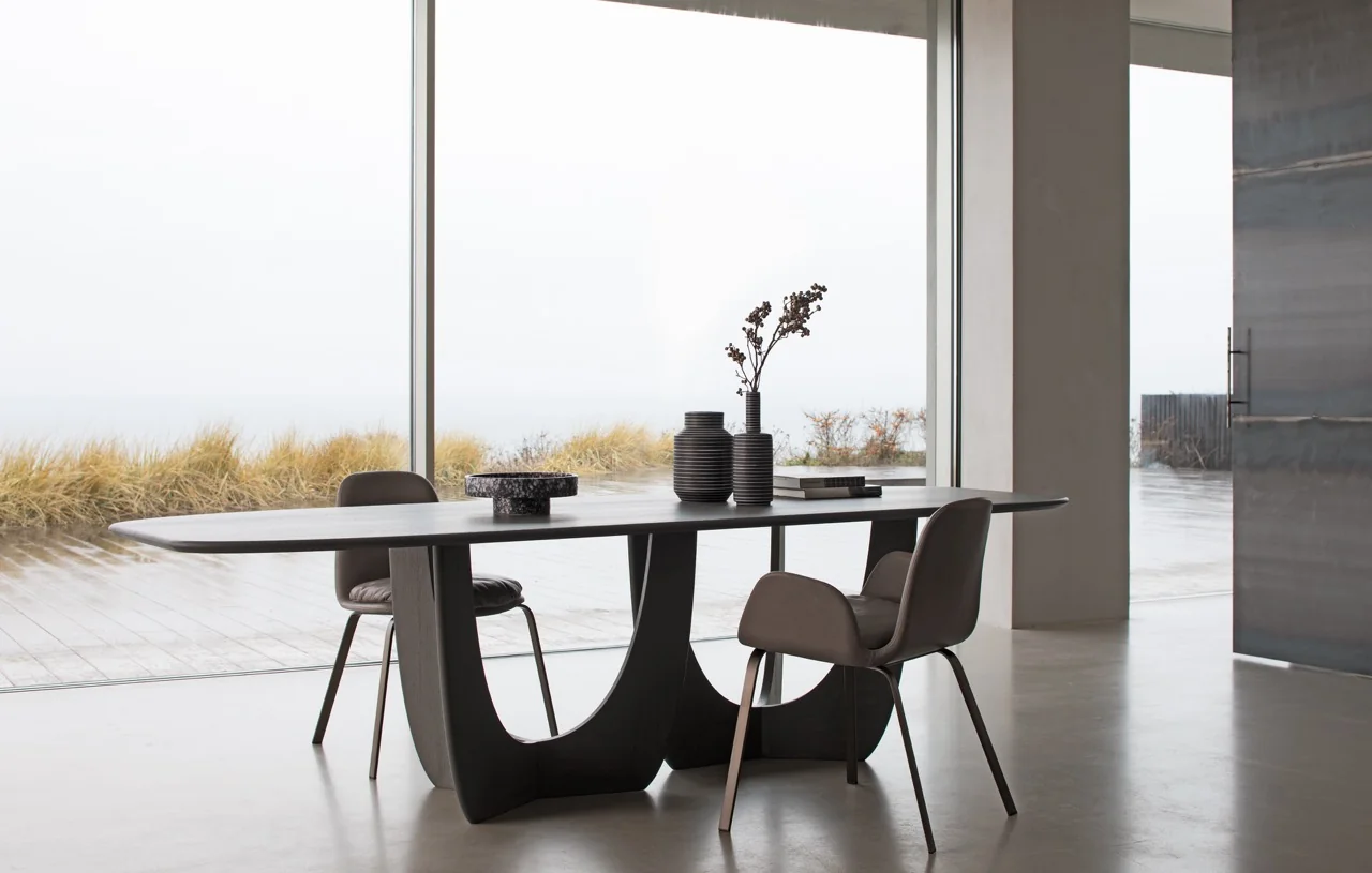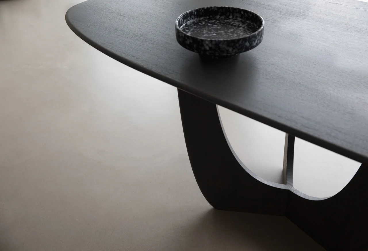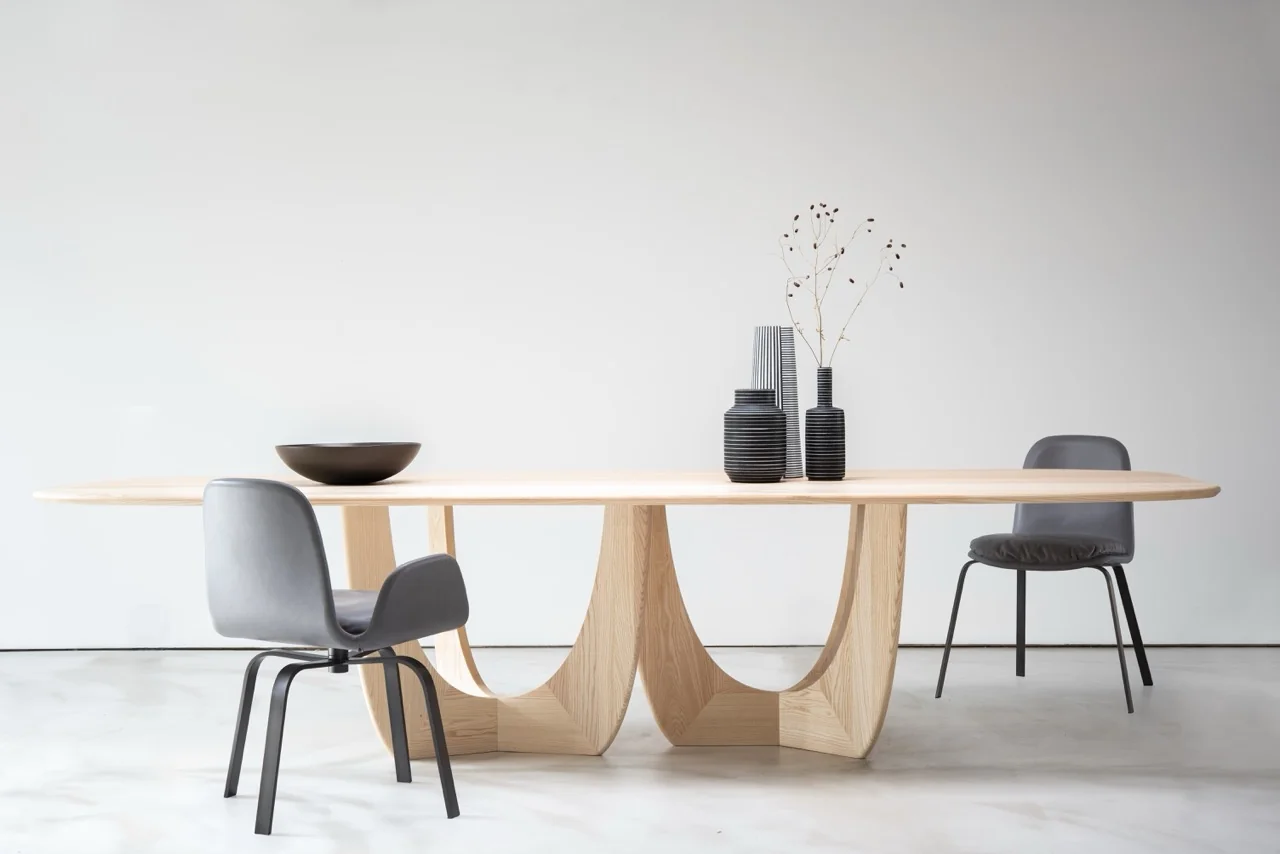 Das Gestell aus Massivholz ist ein wahres Design-Meisterwerk und verleiht dem Tisch eine markante und zugleich elegante Silhouette. Es besticht durch seine kunstvolle Formgebung und macht den Tisch CALA zu einem echten Einrichtungskunstwerk, das seinen Platz im Mittelpunkt des Raumes mehr als verdient.