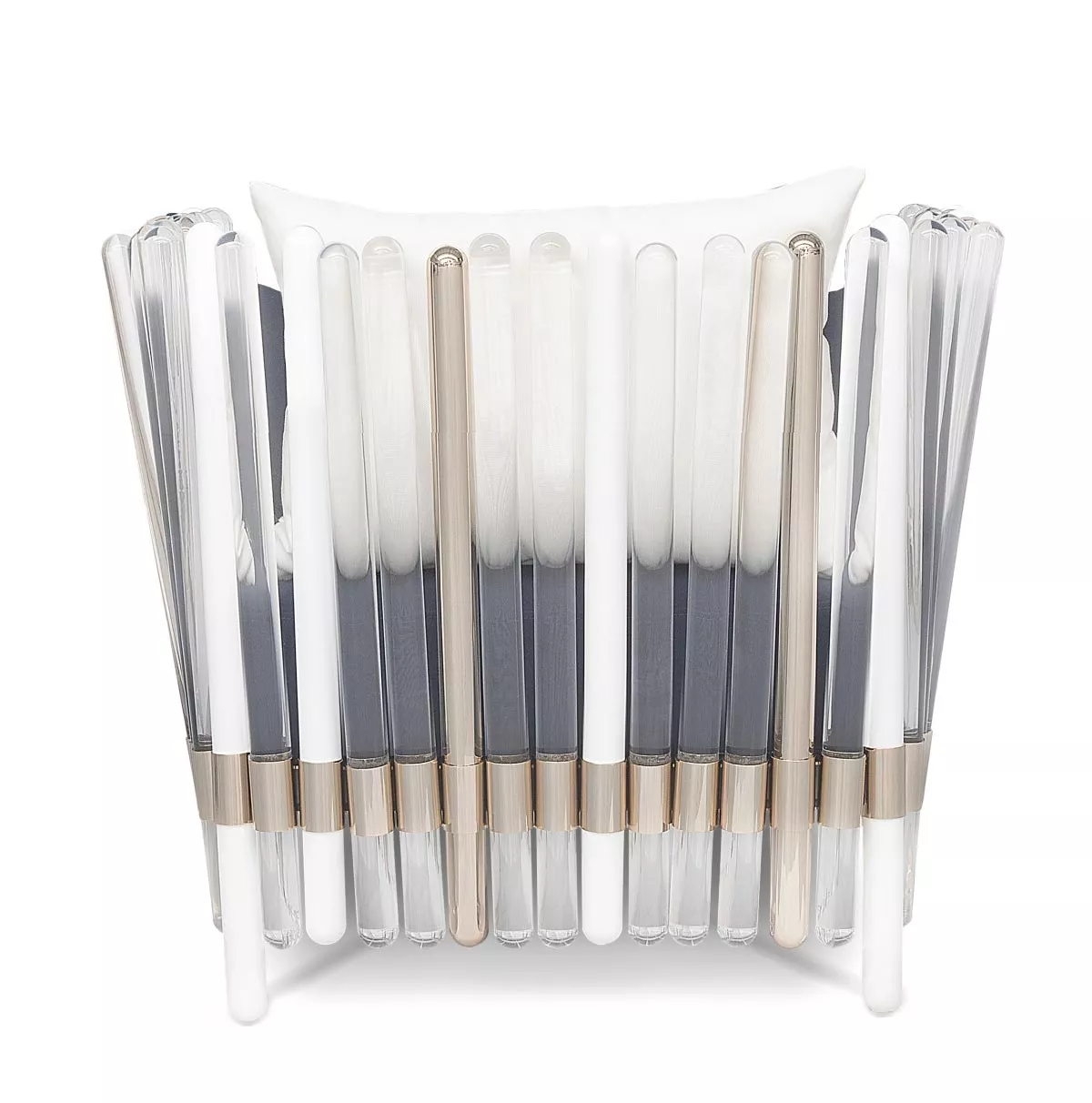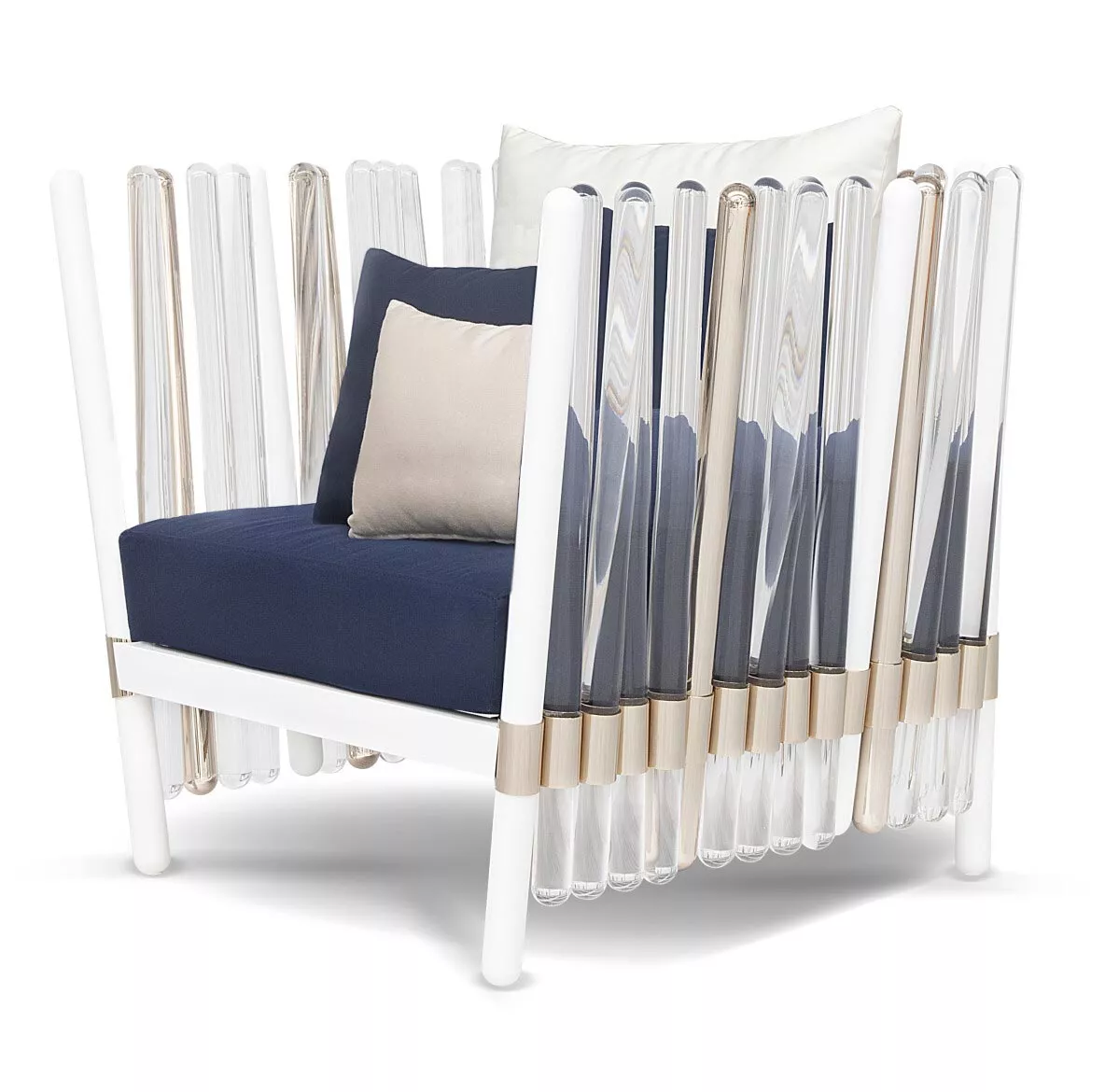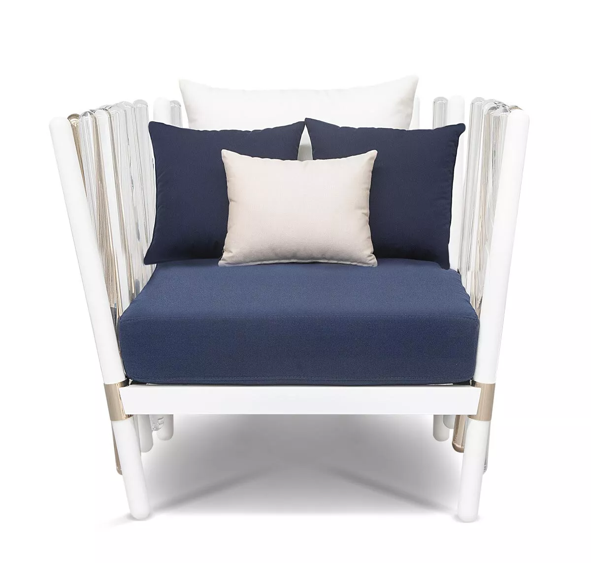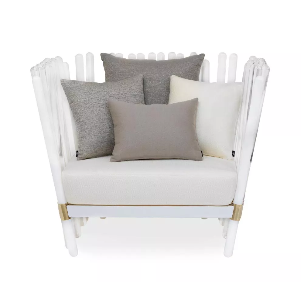 MYFACE Houdini Outdoor Loungesofa • Design Gartensofa MYFACE Stoffauswahl MYFACE Katalog Dieses attraktive Loungesofa wird von Elementen aus lackiertem Edelstahl und Kunststoff gehalten und ist in einer breiten Farbpalette aus wetterfestem Sunbrella Stoff erhältlich, so dass Sie ohne Bedenken hochwertige Momente im Freien genießen können. Im Konzept der Dualität von Sonnenuntergang und Sonnenaufgang liegt die Magie, und nach dieser Ideologie wurde auch der Houdini-Sessel entworfen. Lichter und Schatten, die von Acrylwellen gestreut werden, verschmelzen mit der Außenumgebung rund um die Loungegruppe und sorgen für Raffinesse in jedem Außenbereich. MYAFCE. GESCHAFFEN, UM DAS GLÜCK ZU SUCHEN Inspiriert von den einfachen Dingen des Lebens wie der Wärme der Sonne am Morgen, der Musik, die den Tag einleitet, dem Outfit, das wir wählen, um uns stark zu fühlen - Erfahrungen, die uns das tägliche Glück bescheren. MYAFCE ist eine Marke, die über Outdoor-Möbel hinausgeht und nicht nur ein integraler, sondern ein grundlegender Bestandteil des Lebens wird. Verwurzelt in den neuesten Design-, Musik-, Modetrends und Glück, führt unser kreativer Prozess die Marke dazu, den individuellen Geschmack und die Persönlichkeit zu treffen und spiegelt in seinen Kreationen die Werte wider, die unsere Anhänger und Kunden charakterisieren, und stärkt so diese Beziehung, die uns heilig ist. Armlehnen: Stangen aus klarem Acryl Gestell: Edelstahl weiß pulverbeschichtet • vergoldeter Edelstahl Sitz- und Rückenkissen: Acrylgewebe Schutzhülle: inklusive Maße (B × T × H) 220 × 87 × 81 cm