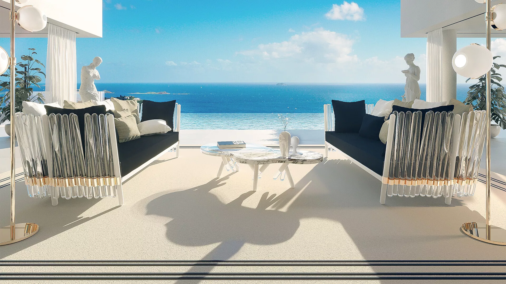 MYFACE Houdini Outdoor Loungetisch • Design-Kaffeetisch MYFACE Stoffauswahl MYFACE Katalog Dieses attraktive Loungetisch wird von Elementen aus lackiertem Edelstahl und Kunststoff gehalten und ist in einer breiten Farbpalette aus wetterfestem Sunbrella Stoff erhältlich, so dass Sie ohne Bedenken hochwertige Momente im Freien genießen können. Im Konzept der Dualität von Sonnenuntergang und Sonnenaufgang liegt die Magie, und nach dieser Ideologie wurde auch der Houdini-Sessel entworfen. Lichter und Schatten, die von Acrylwellen gestreut werden, verschmelzen mit der Außenumgebung rund um die Loungegruppe und sorgen für Raffinesse in jedem Außenbereich. MYAFCE. GESCHAFFEN, UM DAS GLÜCK ZU SUCHEN Inspiriert von den einfachen Dingen des Lebens wie der Wärme der Sonne am Morgen, der Musik, die den Tag einleitet, dem Outfit, das wir wählen, um uns stark zu fühlen - Erfahrungen, die uns das tägliche Glück bescheren. MYAFCE ist eine Marke, die über Outdoor-Möbel hinausgeht und nicht nur ein integraler, sondern ein grundlegender Bestandteil des Lebens wird. Verwurzelt in den neuesten Design-, Musik-, Modetrends und Glück, führt unser kreativer Prozess die Marke dazu, den individuellen Geschmack und die Persönlichkeit zu treffen und spiegelt in seinen Kreationen die Werte wider, die unsere Anhänger und Kunden charakterisieren, und stärkt so diese Beziehung, die uns heilig ist. Armlehnen: Stangen aus klarem Acryl Gestell: Edelstahl weiß pulverbeschichtet • vergoldeter Edelstahl Schutzhülle: inklusive Maße (Ø × H) 85 × 38,5 cm