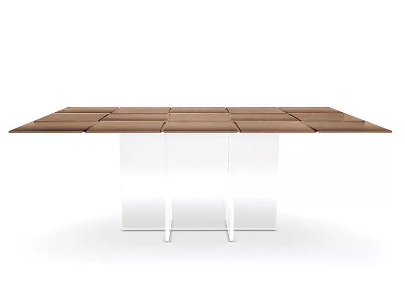 Eine Komposition aus einer massiven, geflochtenen Edelstahltischplatte und einem eleganten Acrylgestell, die zusammen einen auffälligen Look ergeben, der in jedem modernen Außenbereich gewünscht ist