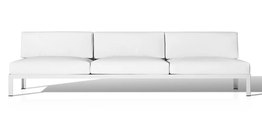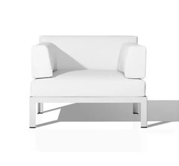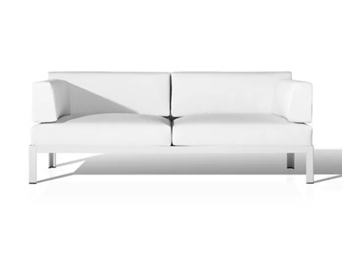 Range of sofas manufactured with an extruded aluminium structure and final finish made with polyester powder coating. Available in 2 widths (L and XL) and 2 heights (High and Low). Cushions: removables. Acrylic fabric: 100% solution dyed acrylic, UV resistance (class. 7/8) with stain and water repellent finish. Washable at 30ºC. Open air drying. Vinytex fabric: synthetic fabric made of plastic coated polyester. Incorporate a waterproof layer. UV resistance (class. 7/8). It is recommended to clean it with neutral soap diluted in large quantity of water.