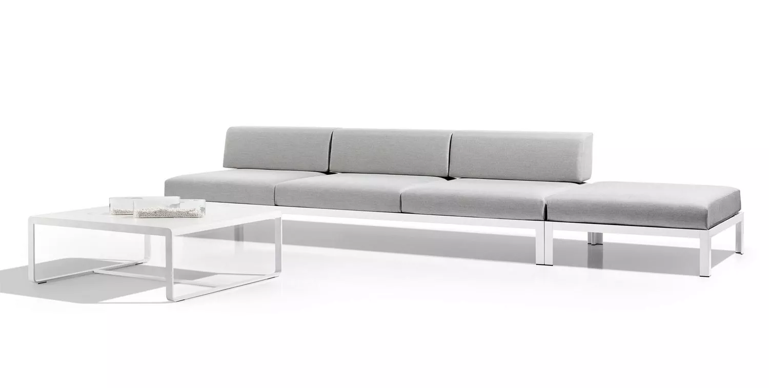 Range of sofas manufactured with an extruded aluminium structure and final finish made with polyester powder coating. Available in 2 widths (L and XL) and 2 heights (High and Low). Anodized: Cushions: removables. Acrylic fabric: 100% solution dyed acrylic, UV resistance (class. 7/8) with stain and water repellent finish. Washable at 30ºC. Open air drying. Vinytex fabric: synthetic fabric made of plastic coated polyester. Incorporate a waterproof layer. UV resistance (class. 7/8). It is recommended to clean it with neutral soap diluted in large quantity of water.
