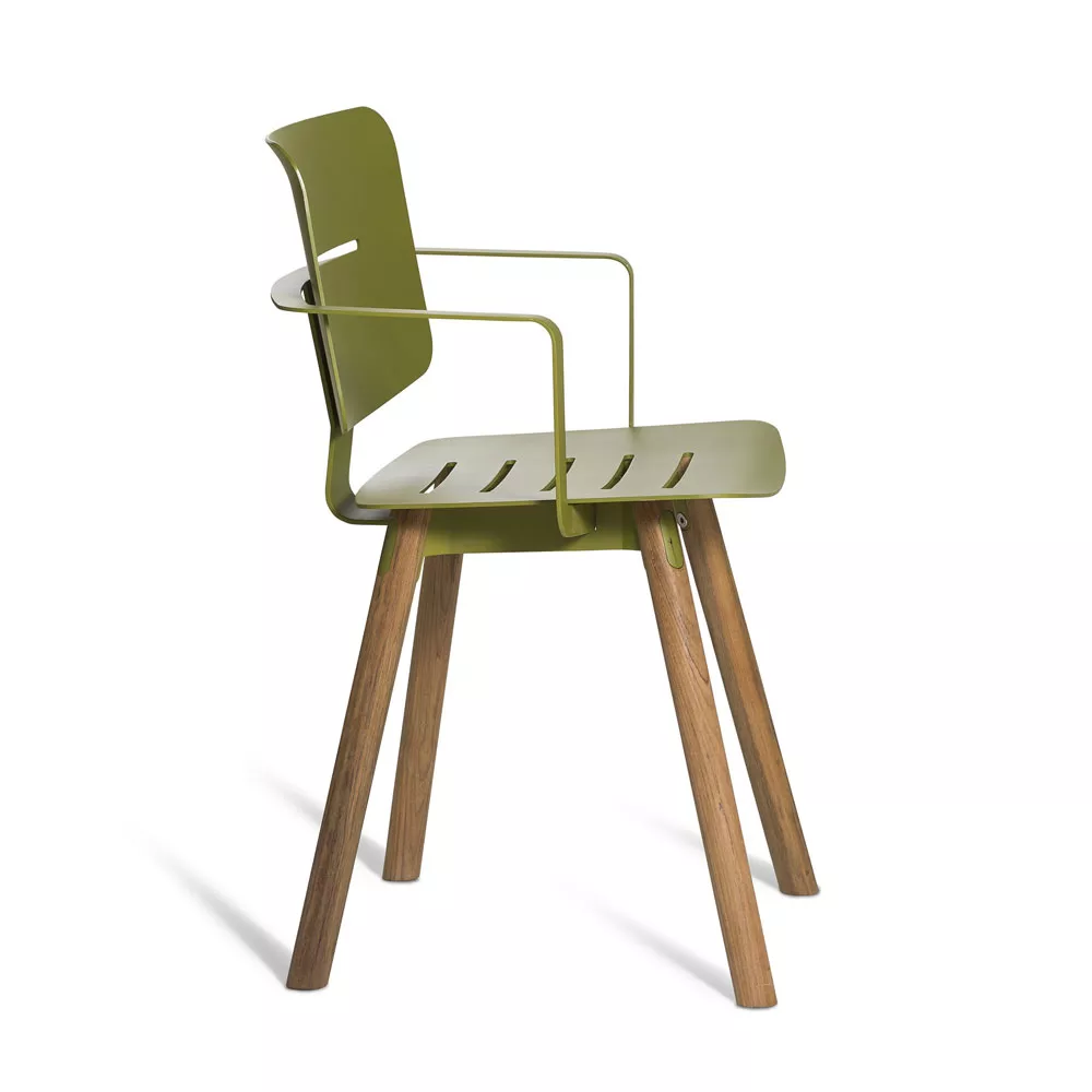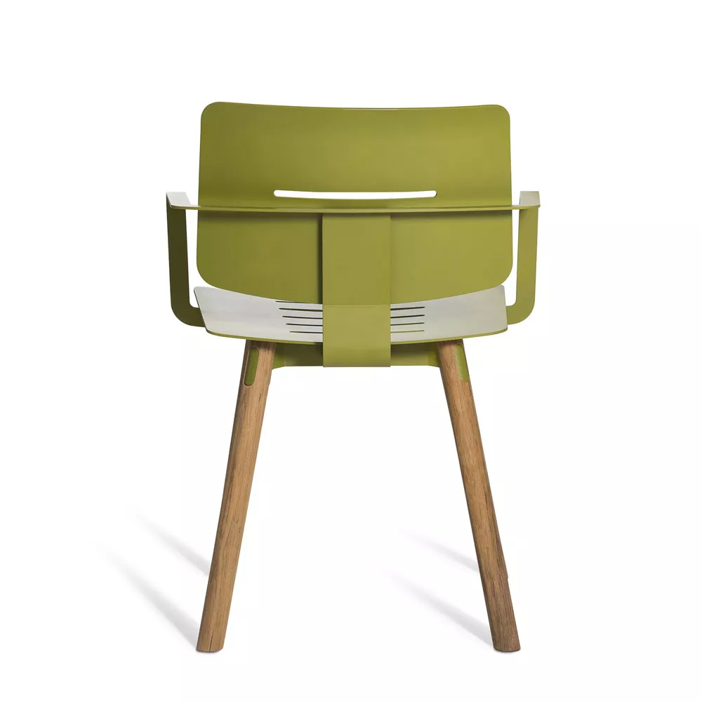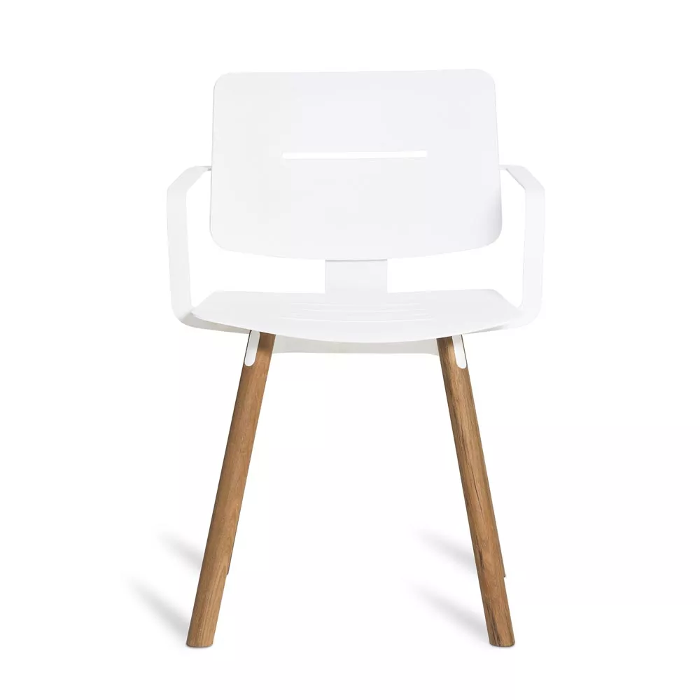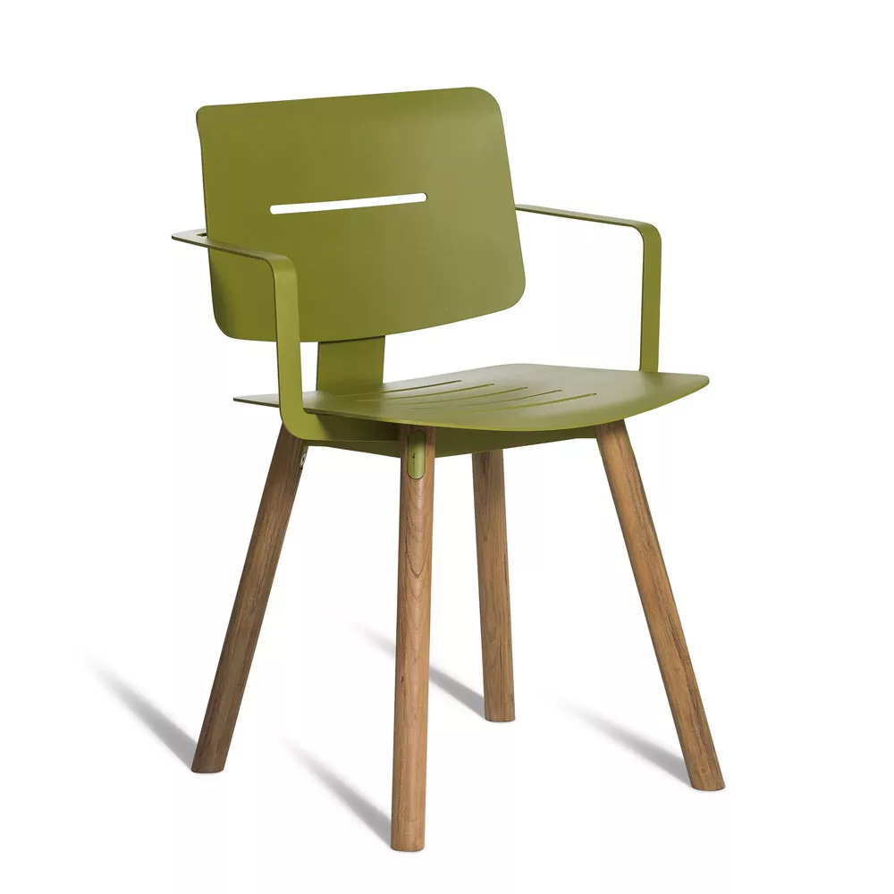 COCO 's funky Flair ist durch eine kreative Mischung von Materialien definiert. Stahlrahmen und Aluminiumsitzpaneele sind in der gleichen Farbe pulverbeschichtet, um ein markantes Erscheinungsbild zu bilden. Elegante Teakholz Beine erhöhen den Kontrast. Passende Sitzkissen sind aus Sunbrella Stoff hergestellt und haben eine dünne Schaumstoffpolsterung. Der gute Sitzkomfort des Stuhls wird dadurch verstärkt.