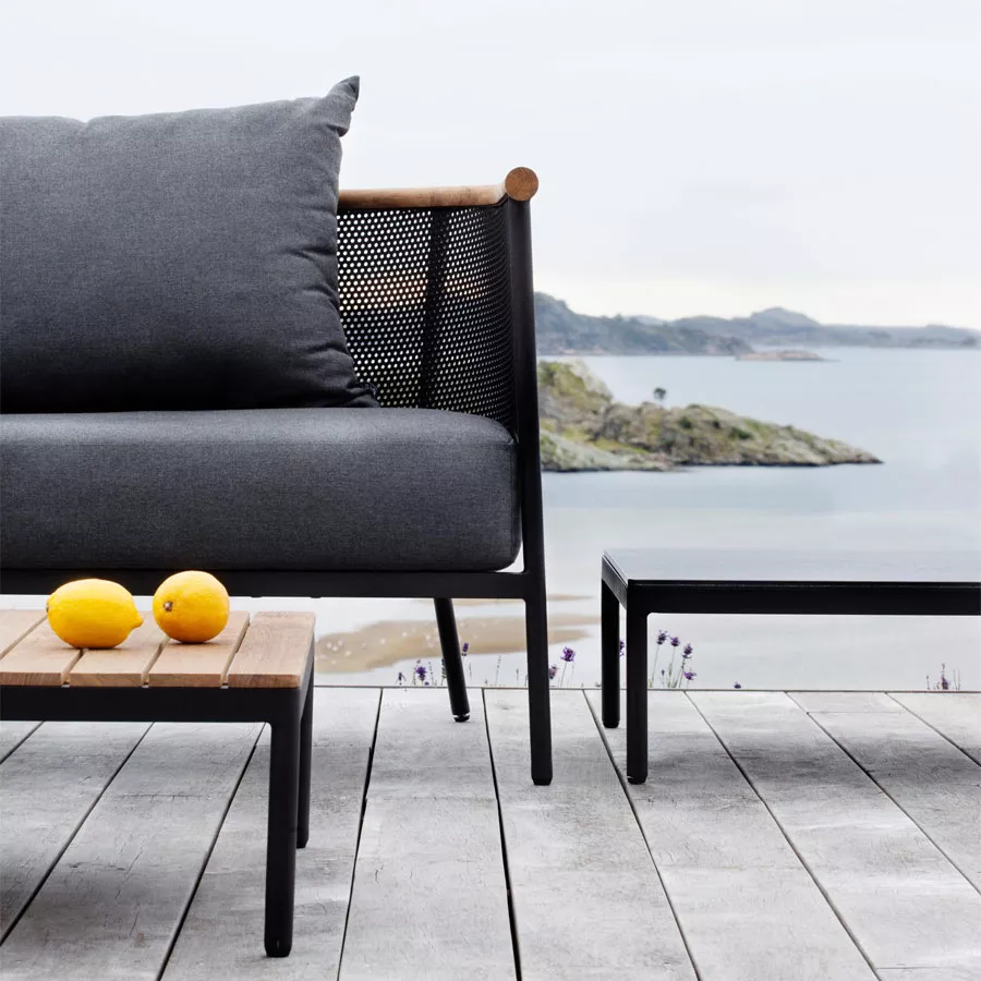 Eine weich gebogene, perforierte Rückenlehne aus leichtem hochwertigen Aluminium. Teakholz-Armlehnen und wetterfeste luxuriöse Kissen bilden ein wunderschönes modulares Sofasystem, das die perfekte Kulisse für die Entspannung im Freien bietet. Die Kollektion RIAD besteht aus einem auffälligen Clubsessel, einem zweisitzigen Gartensofa und sechs verschiedenen Loungemodulen, um nahezu grenzenlose und individuelle Gestaltungsmöglichkeiten umsetzen zu können. Ein rechteckiger Couchtisch und ein quadratischer Beistelltisch mit den passenden Keramik- oder bewährten Tischplatten aus Teakholz vervollständigen diese elegante und einladende Loungekollektion. Lieferbar in drei stilvollen Farben: Anthracite, White oder Pastel Green.