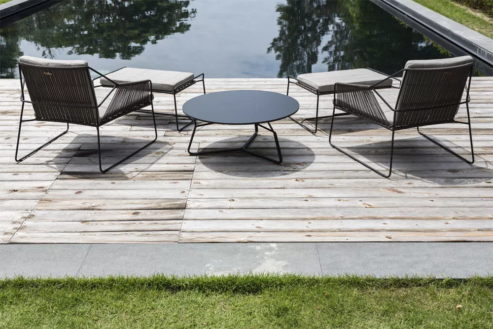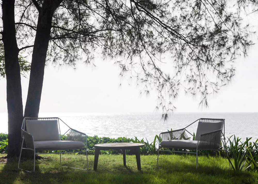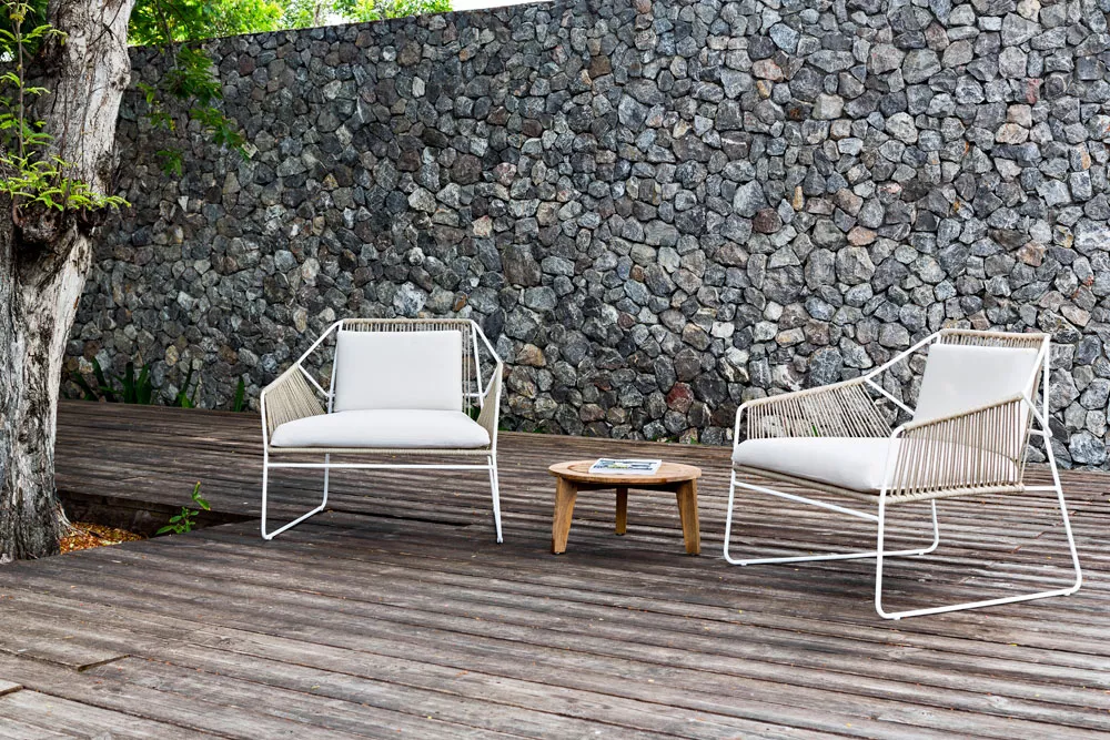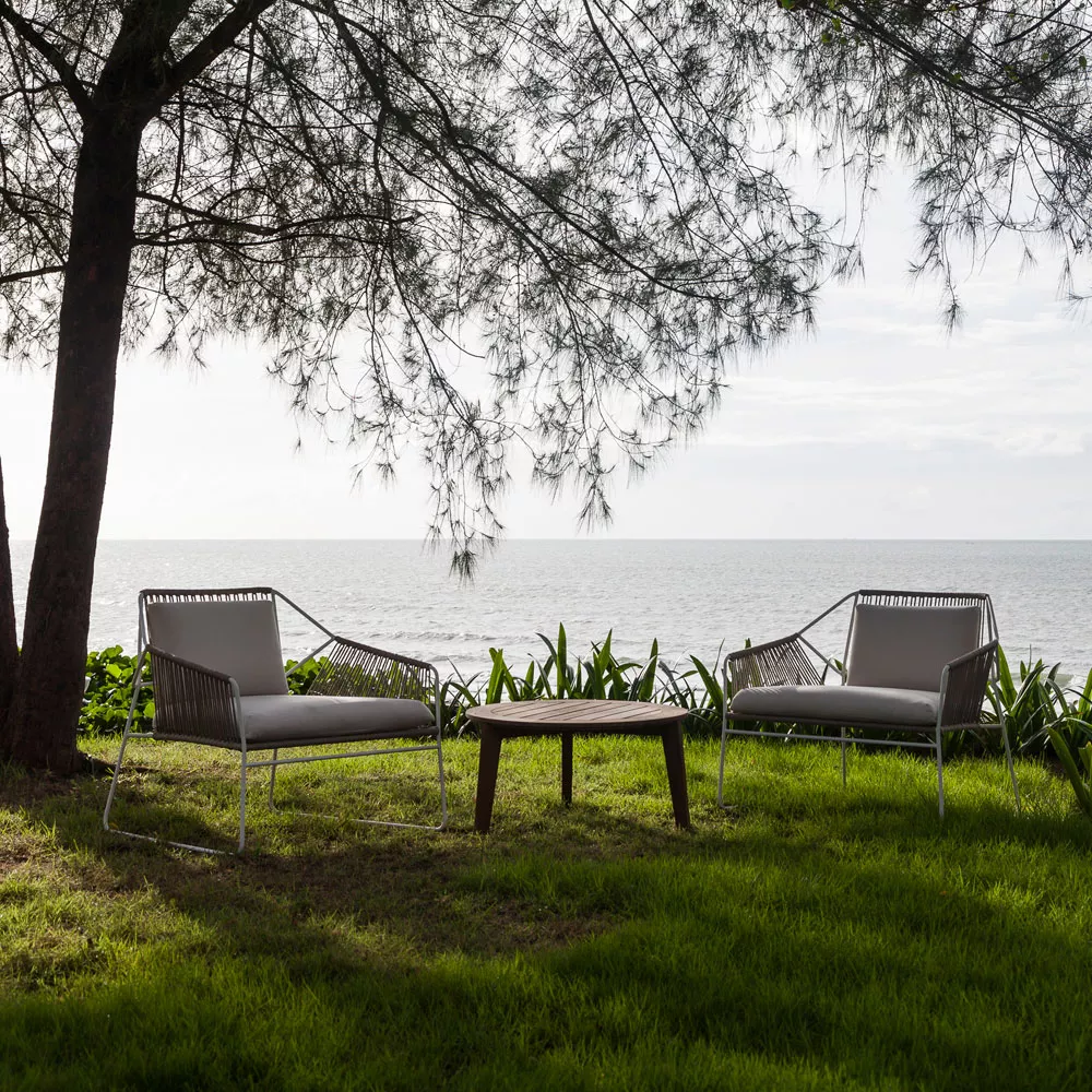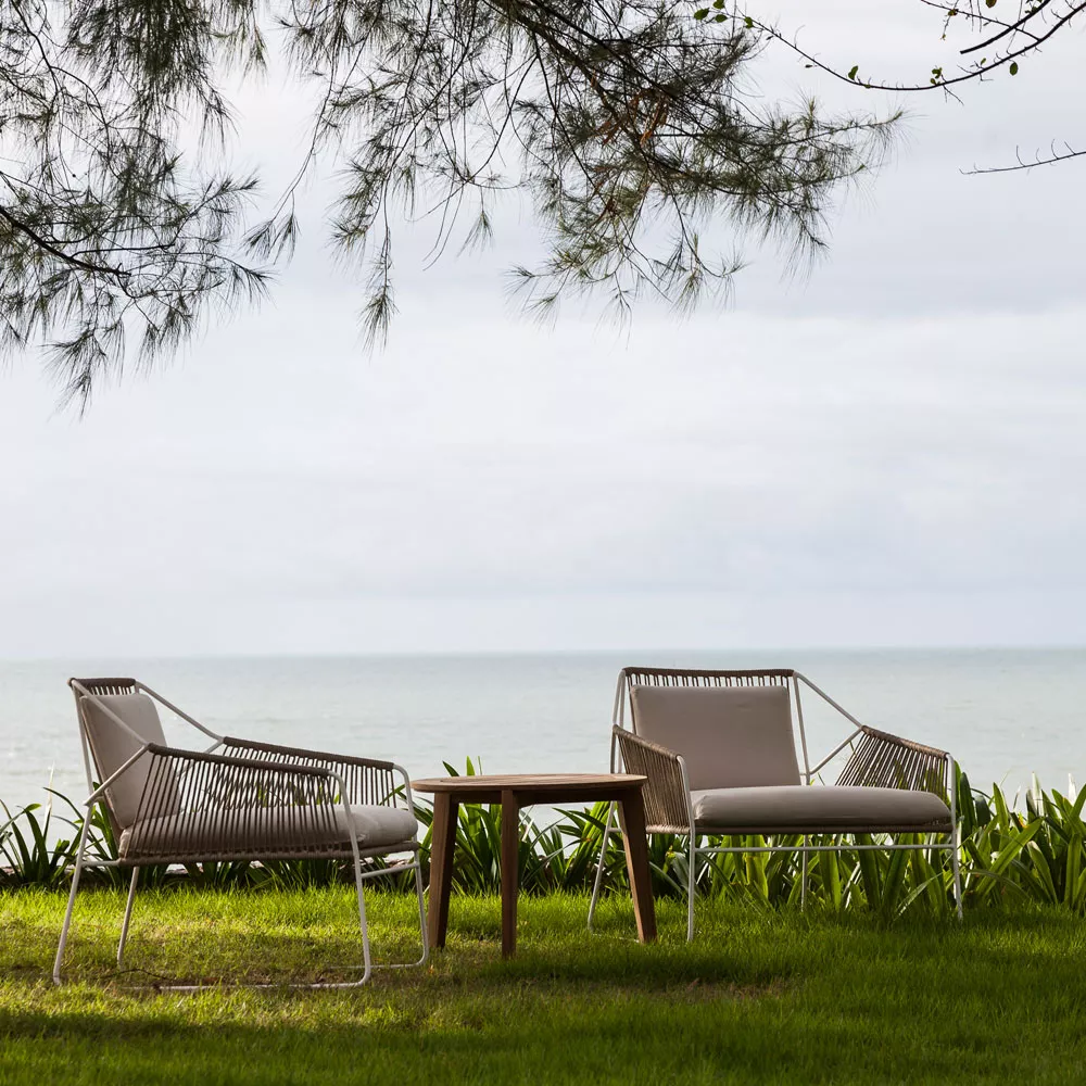 SANDUR's unverwechselbares Muster betont den luftigen Charakter dieser Kollektion. Ein rohrförmiger Edelstahlrahmen unterstützt ein starkes und wetterfestes Kordelgeflecht. Die Kordel wird von geschickten Handwerkern, die stolz auf die hervorragende Qualität ihrer Arbeit sind, auf den Rahmen eingeflohten. Mit einer Vielzahl von stilvollen Farbkombinationen ist diese Kollektion ideal für jede Outdoor-Umgebung. Um den Komfort zu vervollständigen, können Sie Ihre SANDUR Loungegruppe mit den Outdoorkissen Ihrer Wahl kombinieren. Sowohl die Bezüge als auch die Füllungen sind wetterfest und dürfen den gesamten Sommer im Freien verbleiben.