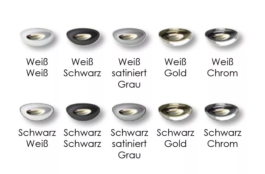 Körper und Befestigungselemente: Schwarz oder Weiß - Vorabdeckung: satiniert Grau, Chrom, Gold, Weiß, Schwarz