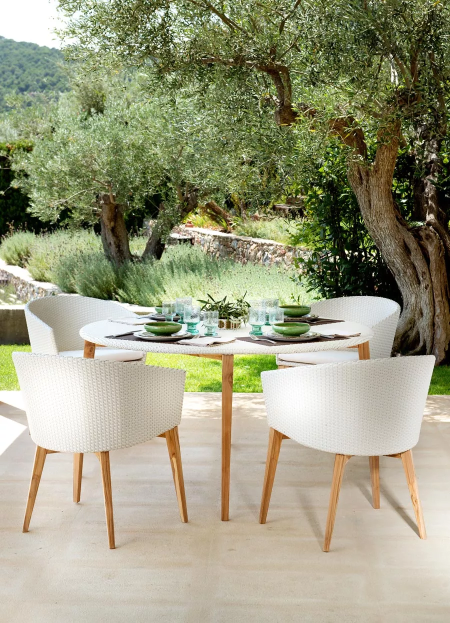 Point Arc Kollektion besteht aus Outdoor Lounge- und Essgruppe. Alle Arc Produkte sind mit einem hochwertigen Teakholzgestell sowie wetterresistentem Kunststoffgeflecht, montiert auf einem Aluminiumrahmen hergestellt. Das Shintotex Synthetikgeflecht ist besonders widerstandsfähig gegenüber Hitze, Regen, Eis, Schnee und UV-Strahlung.