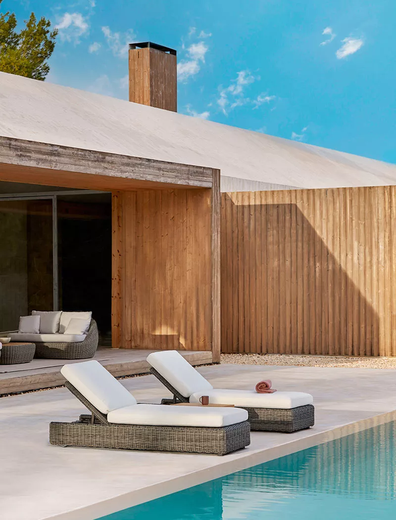 Die Struktur der Liege besteht aus robustem, lackiertem Aluminium, das mit 6 mm starkem Shintotex® Round in der eleganten Farbe Ash Grey umflochten ist. Diese von POINT entwickelte, hochfeste und recycelbare Faser garantiert Langlebigkeit und ein attraktives Erscheinungsbild auch bei intensiver Nutzung im Freien.
