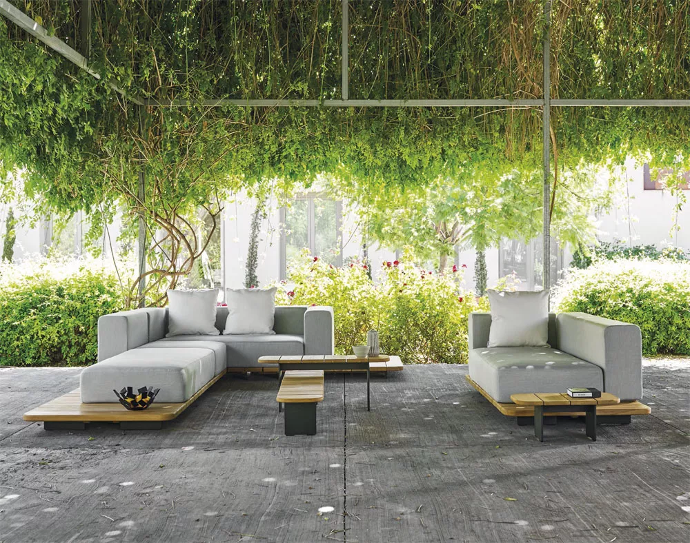 Point 1920 Pal - modulierbares Lounge-System aus massivem Teakholz. Diese Gartenmöbel Kollektion bietet nahezu endlose Möglichkeiten für die individuelle Zusammensetzung einer modernen und bequemen Loungegruppe. Die auf einer festen Teakholzplattform platzierten, gepolsterten Loungemodule bieten viel Platz zum Sitzen und bilden eine erholsame Atmosphäre im Freien. Alle Pal Produkte sind mit einem hochwertigen pulverbeschichteten Aluminium Untergestell sowie wetterresistentem Polster hergestellt. Die verwendete Materialien sind besonders widerstandsfähig gegenüber Hitze, Regen, Eis und Schnee und UV-Strahlung. Mit über 85 Jahren Erfahrung in der Branche gehört Point 1920 zu den Pionieren in der Herstellung, Vermarktung und dem Export hochwertiger Flechtmöbel. Traditionelles Flechthandwerk und moderne Materialien sorgen für einzigartige Gartenmöbel, die durch ihre Exklusivität und Funktionalität begeistern.