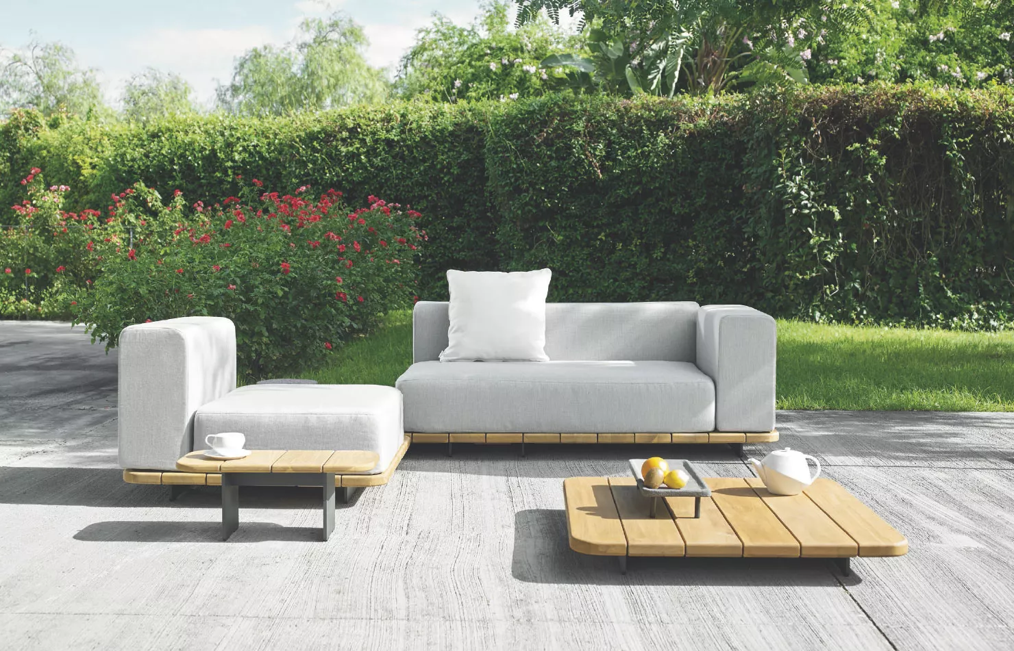 Point 1920 Pal Gartensofa Endmodul Armlehne links 246 cm, Doppelsitz & -Rücken, mit AblageflächePoint 1920 Pal - modulierbares Lounge-System aus massivem Teakholz. Diese Gartenmöbel-Kollektion bietet nahezu endlose Möglichkeiten für die individuelle Zusammensetzung einer modernen und bequemen Loungegruppe. Die auf einer festen Teakholzplattform platzierten, gepolsterten Loungemodule bieten viel Platz zum Sitzen und bilden eine erholsame Atmosphäre im Freien. Alle Pal Produkte sind mit einem hochwertigen pulverbeschichteten Aluminium Untergestell sowie wetterresistentem Polster hergestellt. Die verwendete Materialien sind besonders widerstandsfähig gegenüber Hitze, Regen, Eis und Schnee und UV-Strahlung. Mit über 85 Jahren Erfahrung in der Branche gehört Point 1920 zu den Pionieren in der Herstellung, Vermarktung und dem Export hochwertiger Flechtmöbel. Traditionelles Flechthandwerk und moderne Materialien sorgen für einzigartige Gartenmöbel, die durch ihre Exklusivität und Funktionalität begeistern. Hochwertiges Aluminium Untergestell, beschichtet Plattform aus Teakholz massiv Breite Polster-Farbpalette, wetterfeste Stoffe Wetterbeständig Leicht zu reinigen Maße (B × T × SH / H) 246 × 92 × 34,5 / 60,5 cm