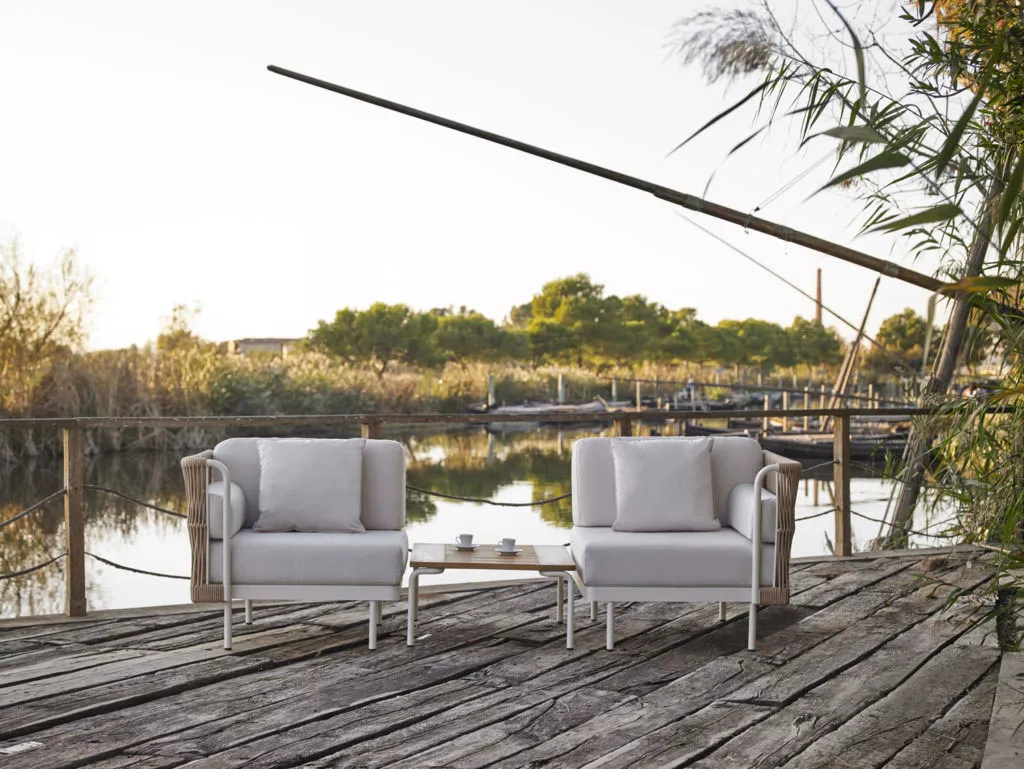 Die brandneue Point Outdoor Serie Weave verbindet feminine Leichtigkeit eines Kunststoffgeflechts mit der geschwungenen Linien des Aluminiumkarkases. Weave - moderne und robuste Kollektion für den Innen- und Außenbereich.