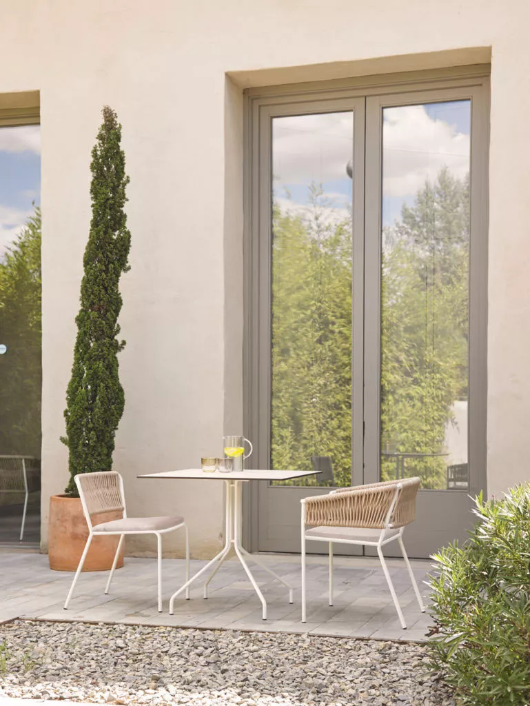Point Gartentisch Weave mit einer HPL Tischplatte und einem Gestell aus Aluminiumrohr.