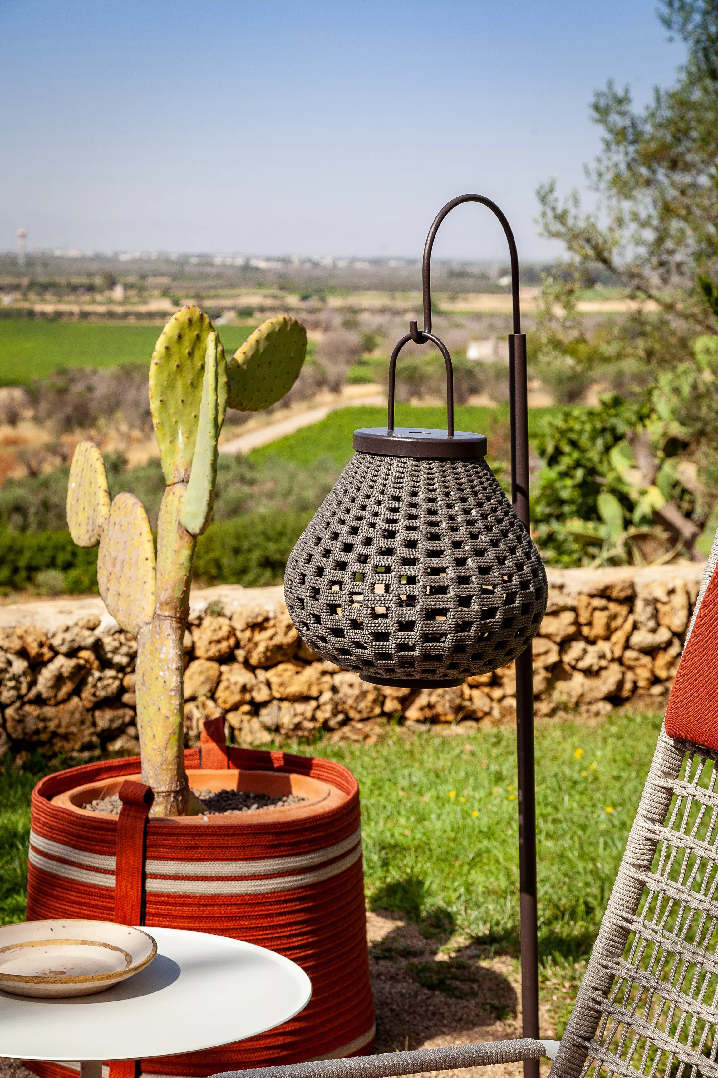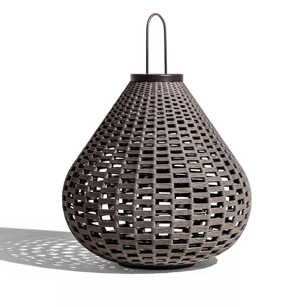 Die Vielseitigkeit der kleinen Laterne wird durch ihre besondere Bauweise unterstrichen. Dank einer speziellen Bogenstütze kann sie mühelos in eine Stehlampe verwandelt werden. Alternativ lässt sich die Laterne durch einen Haken und das Corda-Geflecht auch als Outdoor-Deckenleuchte nutzen.