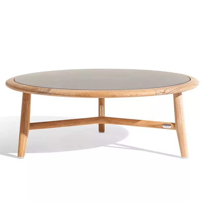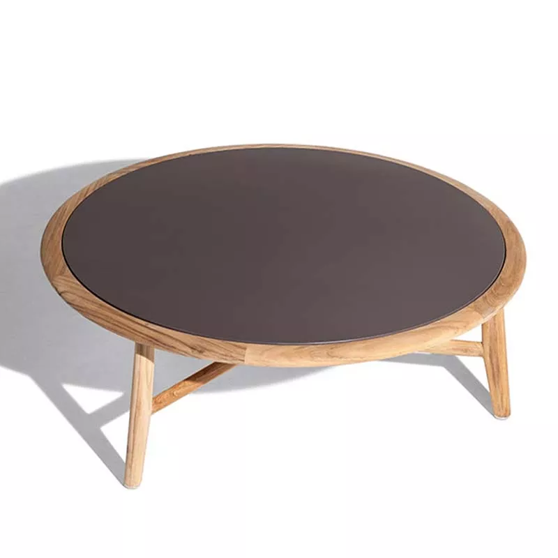 - Tischplatte: aus glasiertem Steingut mit umlaufendem Rahmen mit elliptischen Profil aus Teakholz. in vier Farben erhältlich.