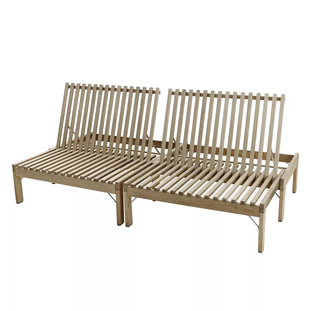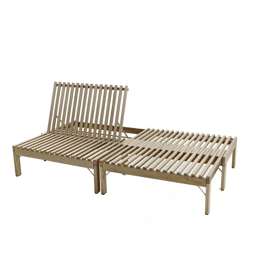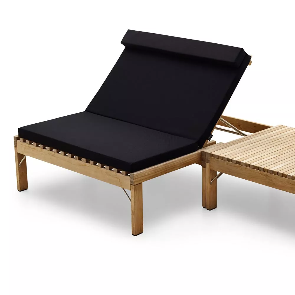 Fritz Hansen Skagerak Sonnenliege Riviera Übersicht Stoffauswahl SkagerakSkagerak verwendet nur ausgereiftes und sorgfältig ausgesuchtes Teakholz, welches unter strickter Befolgung unserer Umweltschutzmaßnahmen geerntet wird. Das Holz stammt von der "Tectona Grandis", einem Baum, der bis zu 45 Meter hoch werden kann und einem Stammdurchmesser von 2,4 m erreichen kann. Der hohe Ölanteil sorgt für geringe Feuchtigkeitsaufnahme sowie geringes Arbeiten im Holz und resultiert in einer enormen Stabilität. Darüber hinaus bietet das Holz hohen Widerstand gegen Ungezieferbefall und Chemikalieneinwirkung. Durch das Gitterprinzip ist die Liege in der Länge variabel und lässt sich etwa auch zur Bank oder zu einem niedrigen Tisch umwandeln. Qualitativ hochwertiges Teakholz Ganzjährig wetterfest Leicht zu reinigen alle Metallteile sind aus massivem Messing, rostfrei B×L×H: 73×115/202×33 cm
