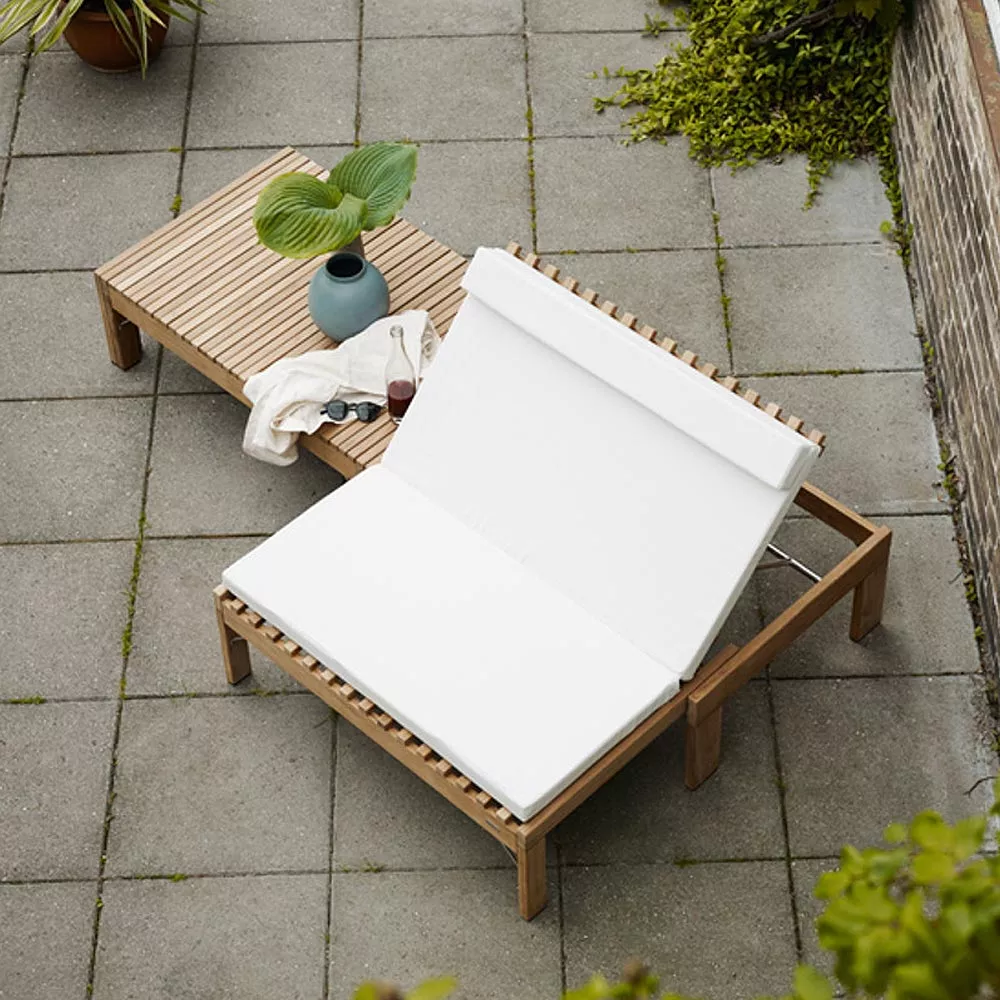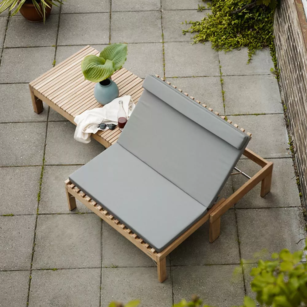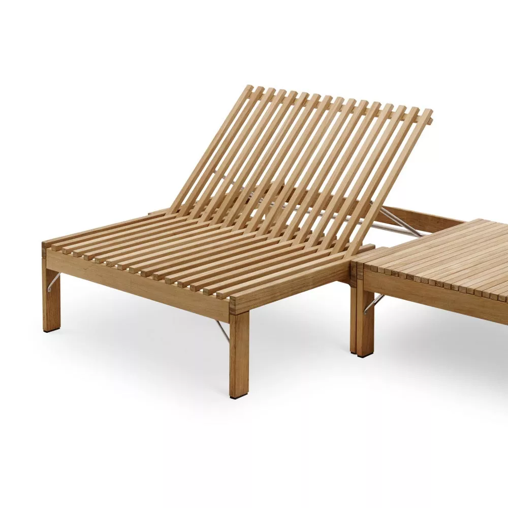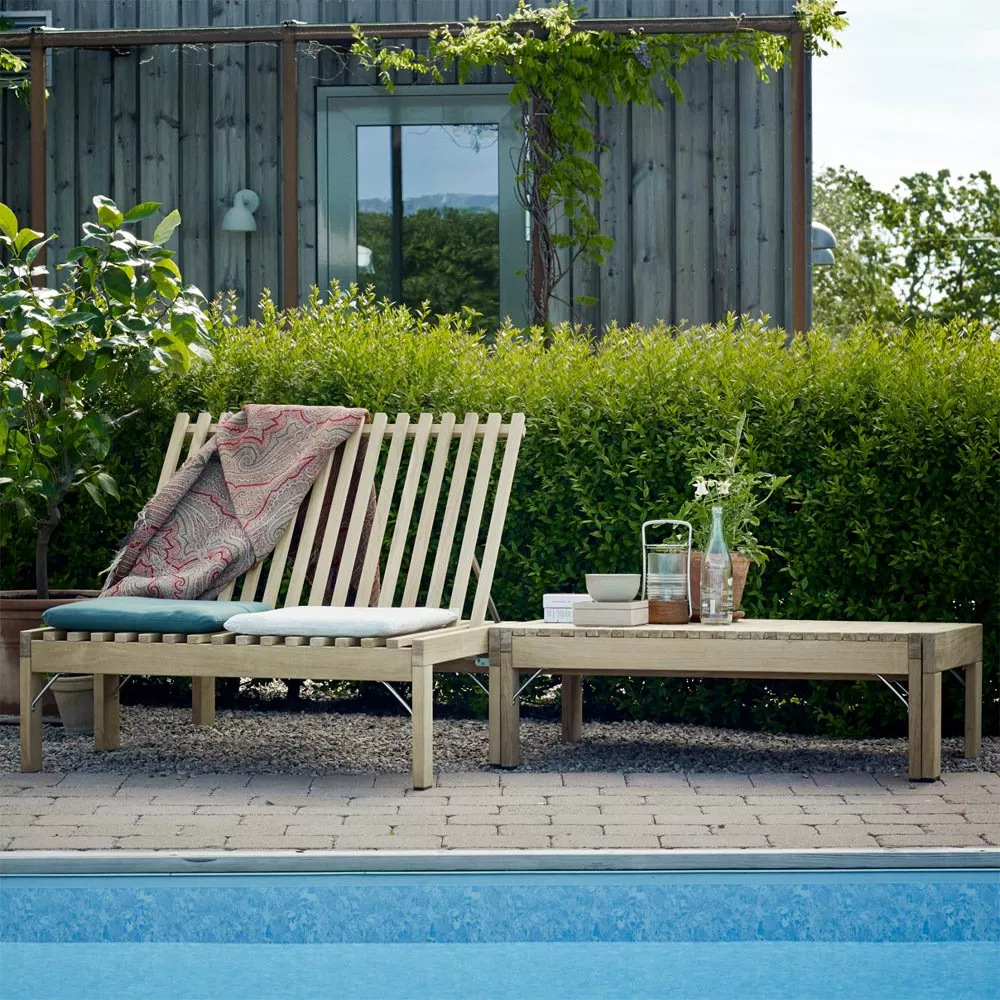 Fritz Hansen Skagerak Sonnenliege Riviera Übersicht Stoffauswahl SkagerakSkagerak verwendet nur ausgereiftes und sorgfältig ausgesuchtes Teakholz, welches unter strickter Befolgung unserer Umweltschutzmaßnahmen geerntet wird. Das Holz stammt von der "Tectona Grandis", einem Baum, der bis zu 45 Meter hoch werden kann und einem Stammdurchmesser von 2,4 m erreichen kann. Der hohe Ölanteil sorgt für geringe Feuchtigkeitsaufnahme sowie geringes Arbeiten im Holz und resultiert in einer enormen Stabilität. Darüber hinaus bietet das Holz hohen Widerstand gegen Ungezieferbefall und Chemikalieneinwirkung. Durch das Gitterprinzip ist die Liege in der Länge variabel und lässt sich etwa auch zur Bank oder zu einem niedrigen Tisch umwandeln. Qualitativ hochwertiges Teakholz Ganzjährig wetterfest Leicht zu reinigen alle Metallteile sind aus massivem Messing, rostfrei B×L×H: 73×115/202×33 cm