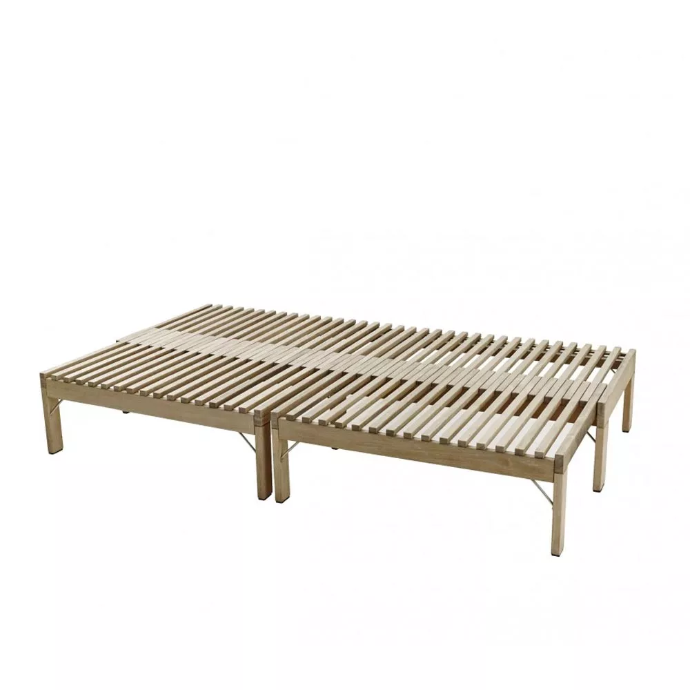 Riviera Lounge basiert auf der ursprünglichen Riviera Sonnenliege, die sich in der Länge erweitern kann. Hier ist die Erweiterung nicht in der Länge, sondern in der Breite, so dass die modulierbare Lounge-Elemente als Sessel, Loungetisch oder Liege dienen.