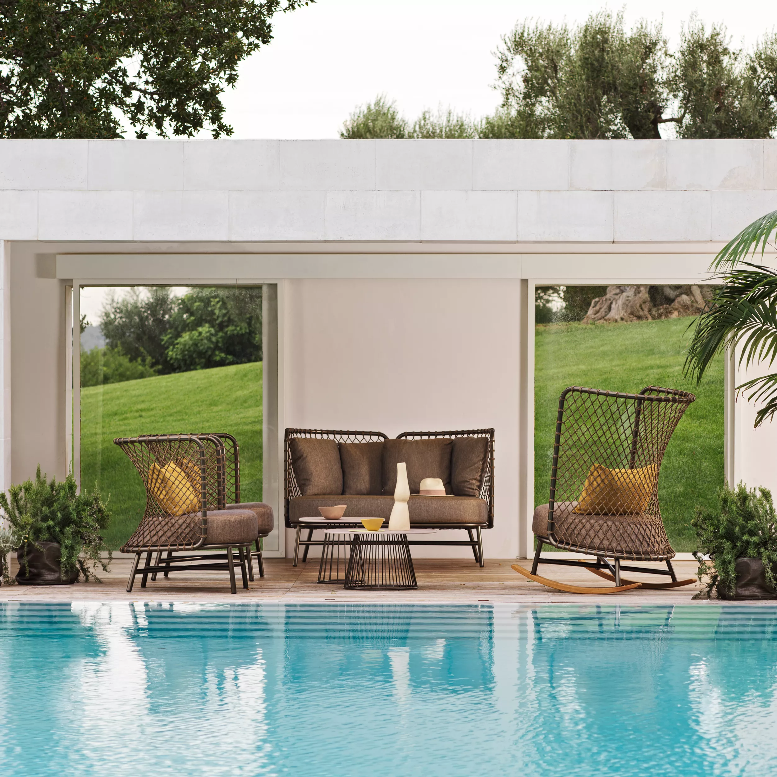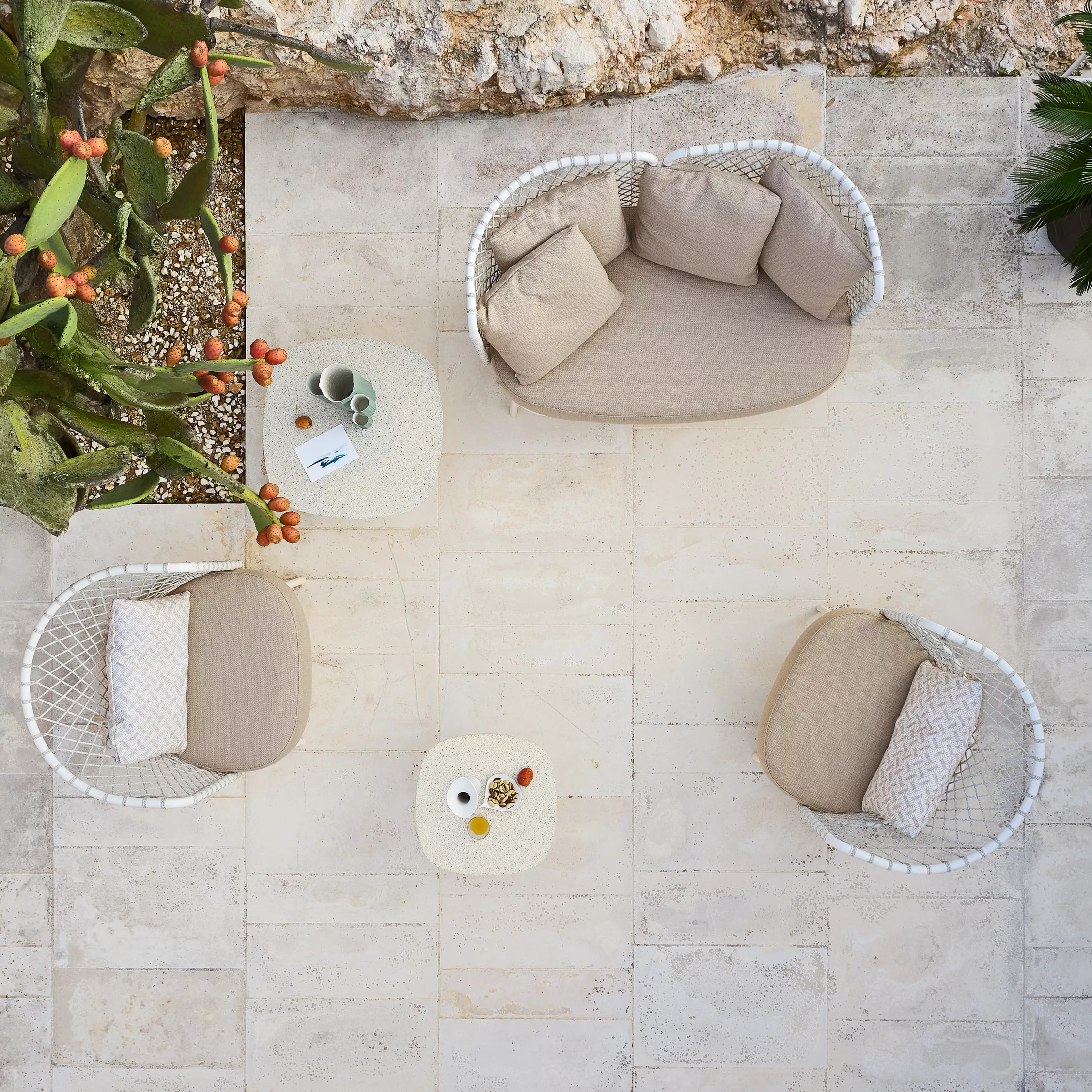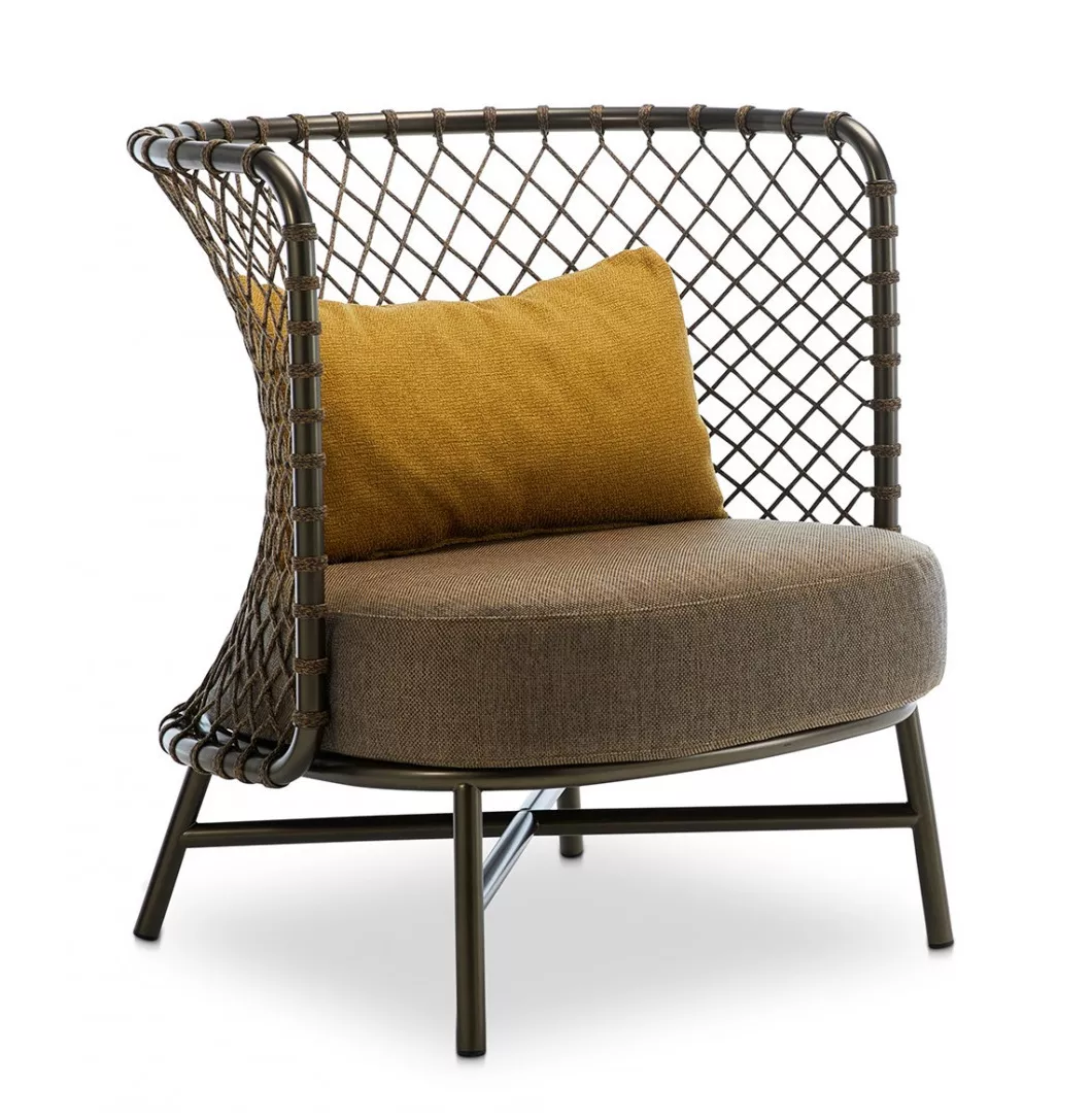 Charme ist eine Kollektion von innovativer Eleganz, mit einem leichten und umhüllenden Design, bei dem das Seil in den Rückenlehnen von Stühlen, Sesseln, Sofas und Schaukelstühlen hervorgehoben wird. Seine Geometrie, die durch die unterschiedlichen Spannungen des Geflechts entsteht, passt sich natürlich dem Körper an und bietet einen besonder hohen Komfort. Die Elemente werden in der warmen Ausführung Bronze oder im klassischen Weiß angeboten. Der Tisch mit einer dynamischen Form und die kleinen Tische vervollständigen die Linie und schlagen bequeme Umgebungen sowohl für den Außen- als auch für den Innenbereich vor.