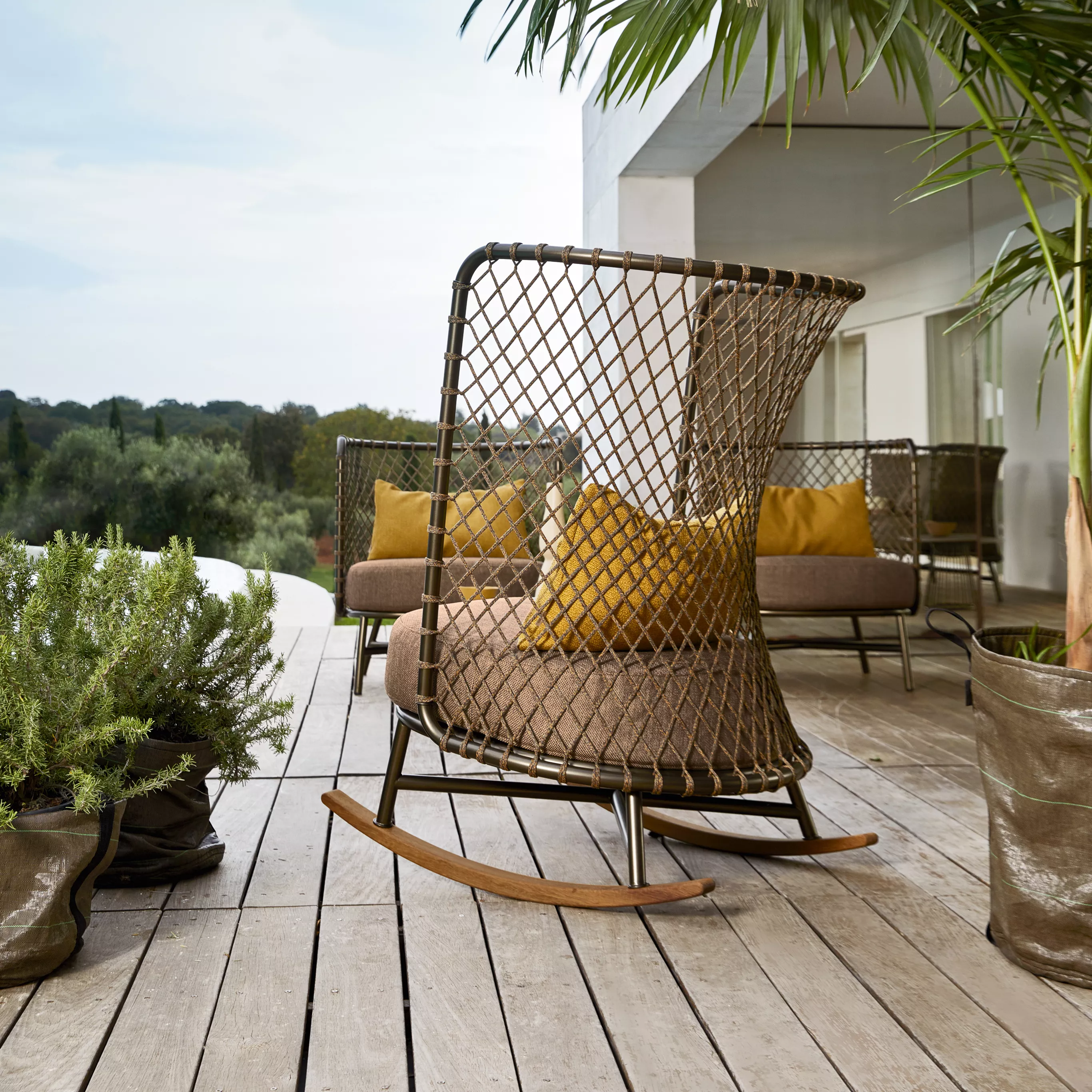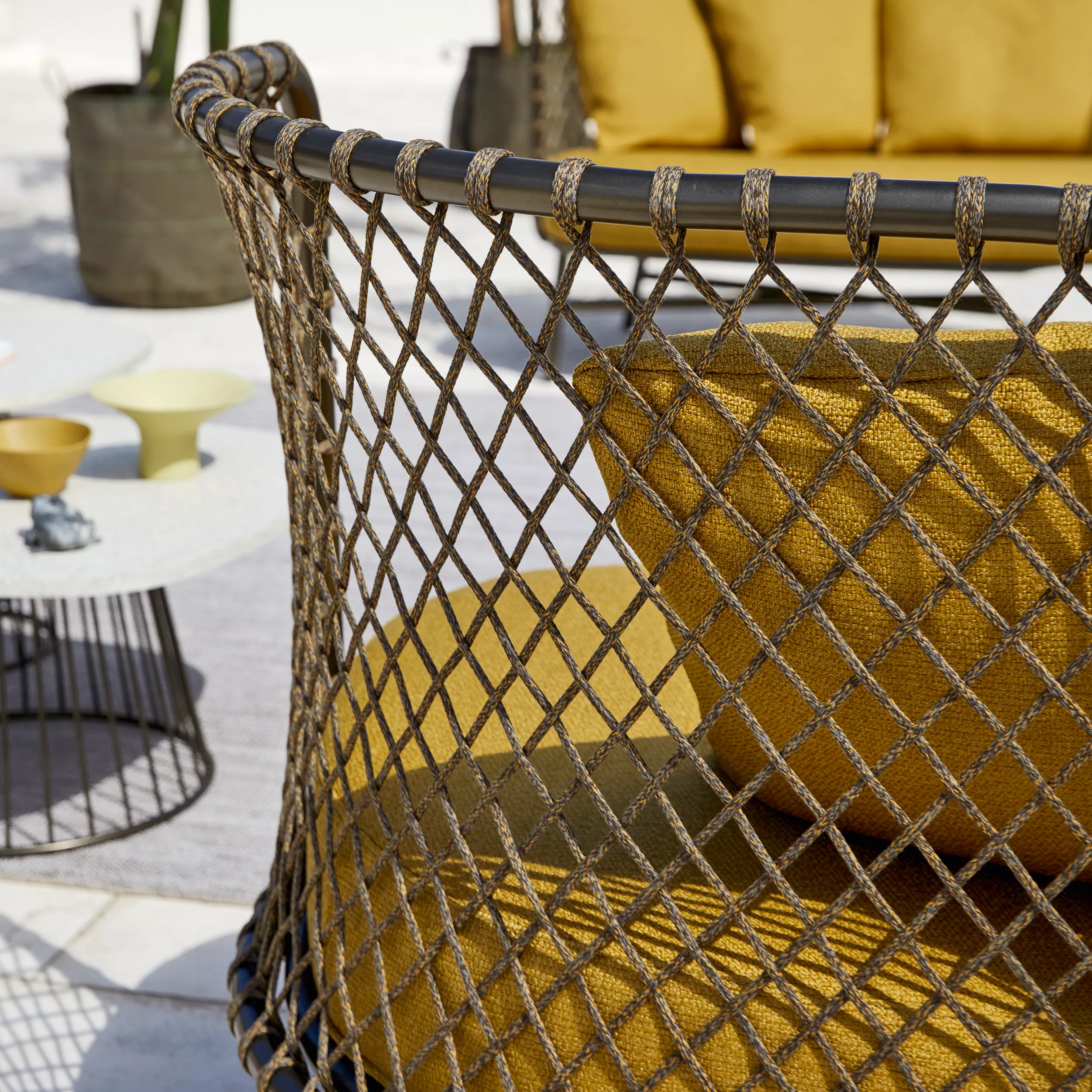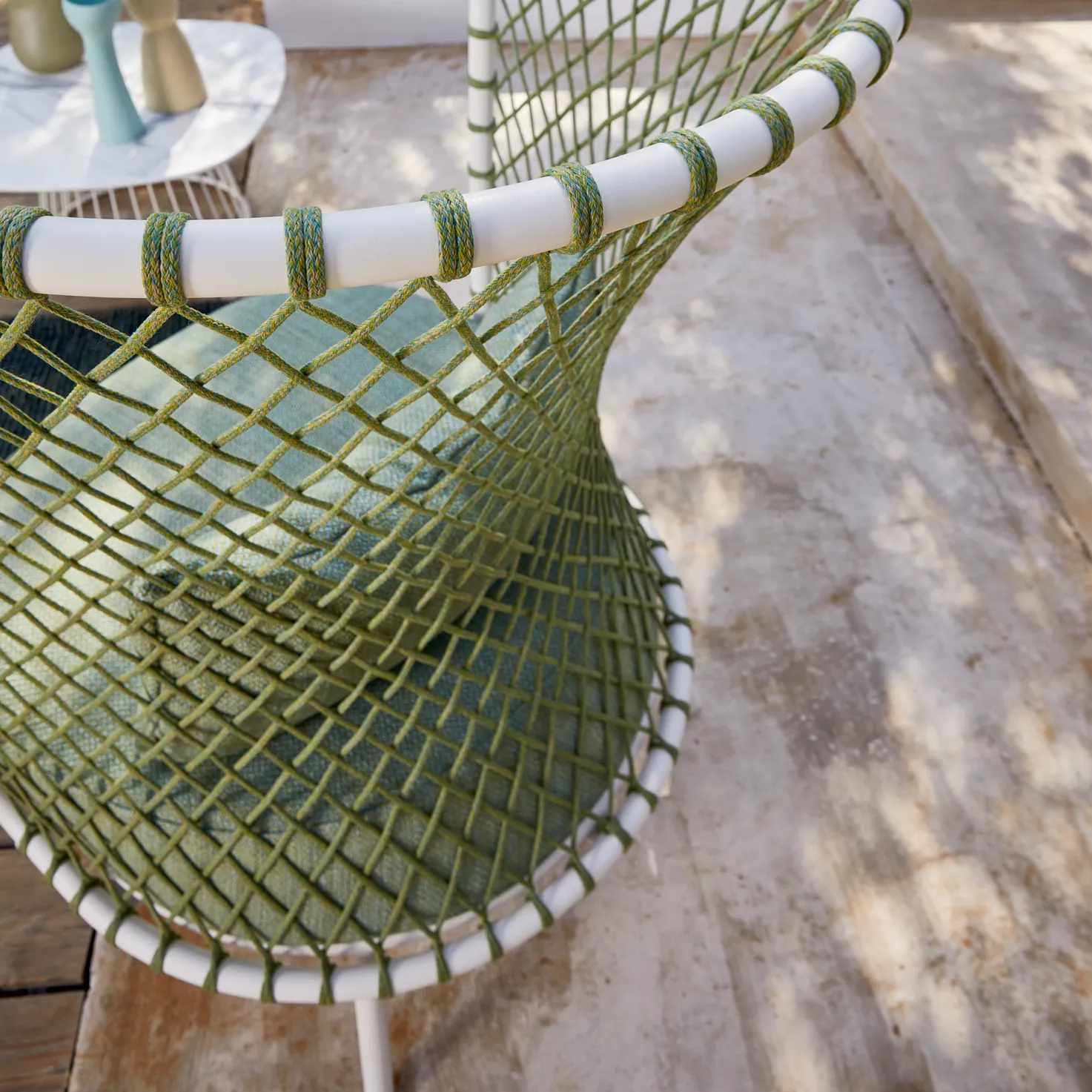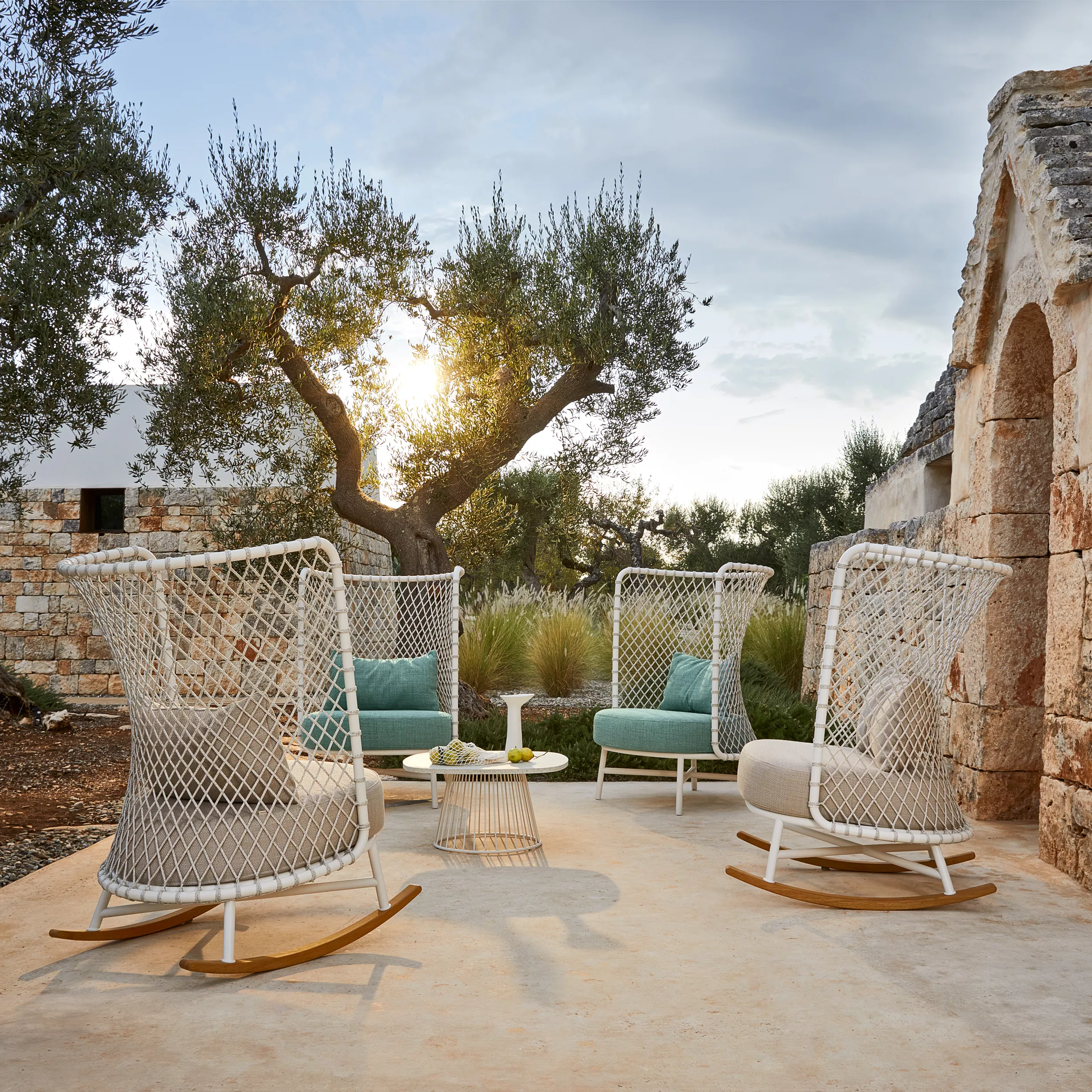 Charme ist eine Kollektion von innovativer Eleganz, mit einem leichten und umhüllenden Design, bei dem das Seil in den Rückenlehnen von Stühlen, Sesseln, Sofas und Schaukelstühlen hervorgehoben wird. Seine Geometrie, die durch die unterschiedlichen Spannungen des Geflechts entsteht, passt sich natürlich dem Körper an und bietet einen besonder hohen Komfort. Die Elemente werden in der warmen Ausführung Bronze oder im klassischen Weiß angeboten. Der Tisch mit einer dynamischen Form und die kleinen Tische vervollständigen die Linie und schlagen bequeme Umgebungen sowohl für den Außen- als auch für den Innenbereich vor.