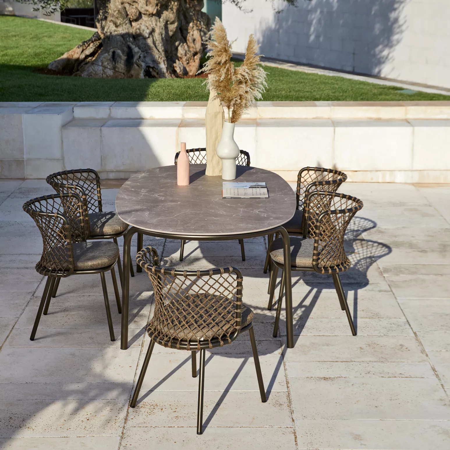 Charme ist eine Kollektion von innovativer Eleganz, mit einem leichten und umhüllenden Design, bei dem das Seil in den Rückenlehnen von Stühlen, Sesseln, Sofas und Schaukelstühlen hervorgehoben wird. Seine Geometrie, die durch die unterschiedlichen Spannungen des Geflechts entsteht, passt sich natürlich dem Körper an und bietet einen besonder hohen Komfort. Die Elemente werden in der warmen Ausführung Bronze oder im klassischen Weiß angeboten. Der Tisch mit einer dynamischen Form und die kleinen Tische vervollständigen die Linie und schlagen bequeme Umgebungen sowohl für den Außen- als auch für den Innenbereich vor.