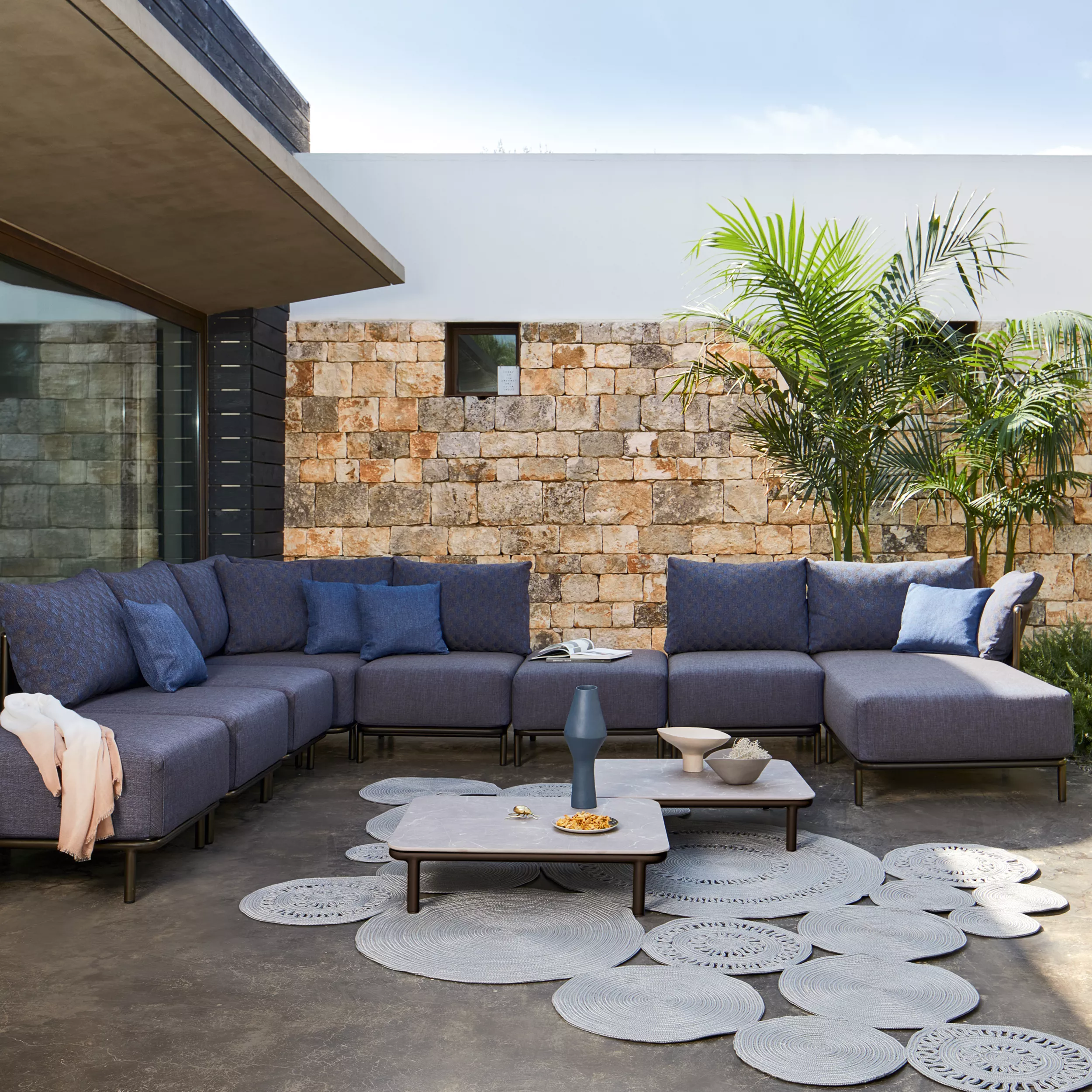 Bei der Queen-Kollektion wird Komfort mit Schönheit durch eine leichte und durchdachte Ästhetik kombiniert. Sofas, Sessel und Chaiselongue sind ebenfalls modulare, vielseitige Elemente. Ein Sitzsystem, bei dem mit Transparenzen und natürlichen Tönen gespielt wird, die durch das elegante lineare Geflecht entstehen, den Raum als einen Ort interpretieren, an dem man seine Zeit in perfekter Harmonie verbringen kann. Die Kollektion wird in der Ausführung Bronze, die tiefe und mediterrane Szenarien suggeriert, und in der raffinierten Ausführung Weiß angeboten. Geeignet für den Außen- und Innenbereich, für den Wohn- und Objektbereich.