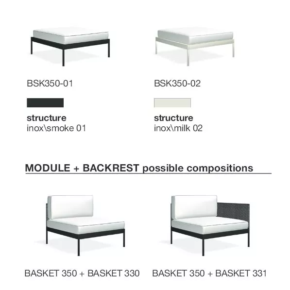 Basket Outdoor Loungemodul 354+331 von Roda Die historische Kollektion Basket, von Gordon Guillaumier, wurde durch ein modulierbares Loungesofa mit hoher Rückenlehne erweitert. Die BASKET Loungegruppe mit dem hohen Sofa verwandelt jeden Raum sehr raffiniert zu einem fortschrittlichen und komfortablen Sitzbereich. Kollektion BASKET von RODA ist ein Projekt, dass sich durch die extreme formale Einfachheit auszeichnet und besteht aus modulierbaren Sofas und Tischen, die elegant und anspruchsvoll Ihren Innen- und Außenbereich vervollständigen. Die robuste pulverbeschichtete Edelstahlkonstruktion mit der strengen Linie der Rückenlehnen und Sitze wird mit dem absoluten Komfort der Polster verbunden. Loungegruppe BASKET wird mit Edelstahlgestell in Rauch- oder Milchfarbe mit einem grauen oder sandfarbenden Gurtgeflecht gefertigt. Gestell: Edelstahl pulverbeschichtet Rückenlehne Gurtgeflecht: Polyester Auflagefäche für den Sitz: Batyline die Herstellung dieser hochwertigen Möbel erfolgt in erstklassiger Qualität UV-, witterungs- und farbbeständig leicht zu reinigen Maße: (B × T × H) 135 × 135 × 39/67 (28/11/39) cm