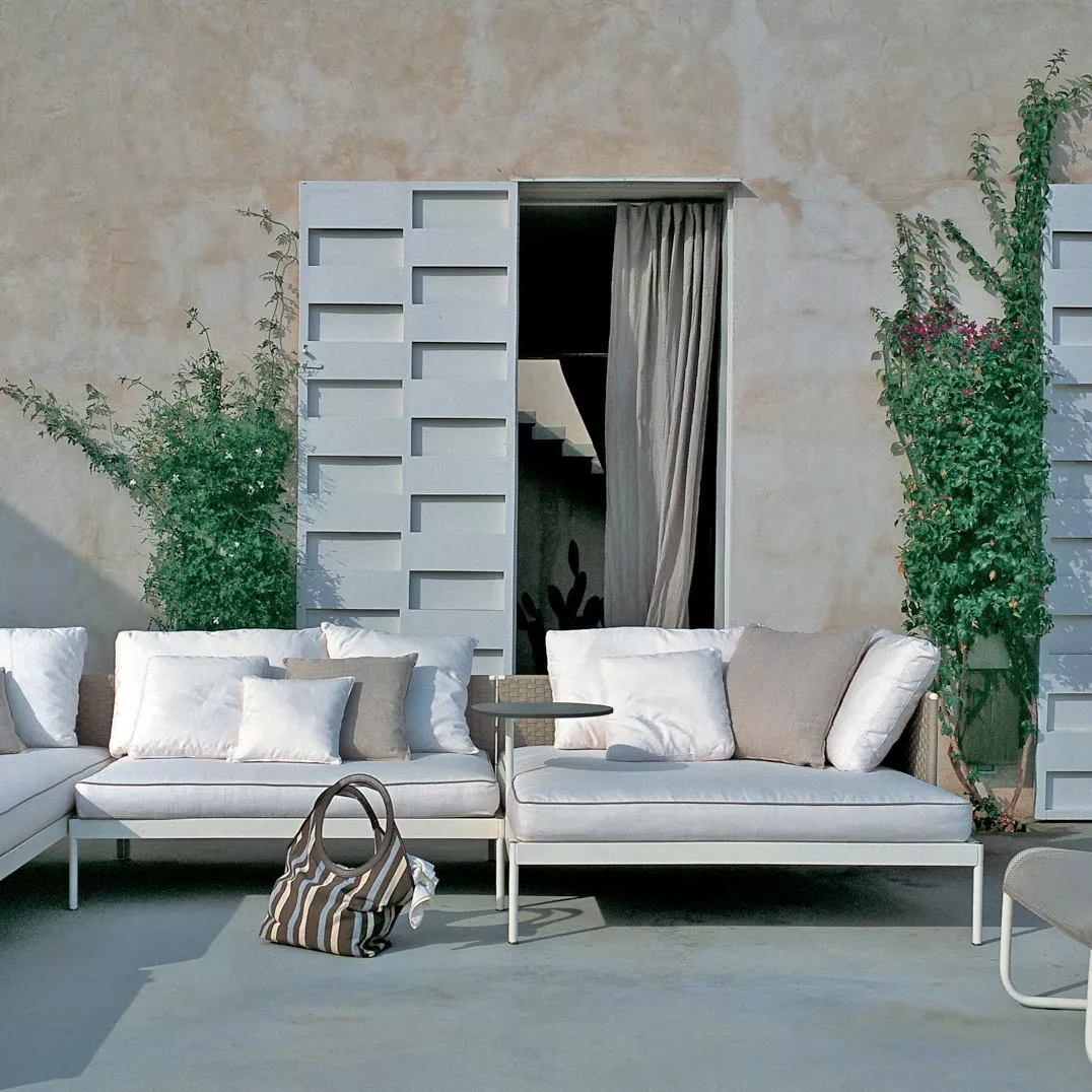 Basket Outdoor Loungemodul 354+331 von Roda Die historische Kollektion Basket, von Gordon Guillaumier, wurde durch ein modulierbares Loungesofa mit hoher Rückenlehne erweitert. Die BASKET Loungegruppe mit dem hohen Sofa verwandelt jeden Raum sehr raffiniert zu einem fortschrittlichen und komfortablen Sitzbereich. Kollektion BASKET von RODA ist ein Projekt, dass sich durch die extreme formale Einfachheit auszeichnet und besteht aus modulierbaren Sofas und Tischen, die elegant und anspruchsvoll Ihren Innen- und Außenbereich vervollständigen. Die robuste pulverbeschichtete Edelstahlkonstruktion mit der strengen Linie der Rückenlehnen und Sitze wird mit dem absoluten Komfort der Polster verbunden. Loungegruppe BASKET wird mit Edelstahlgestell in Rauch- oder Milchfarbe mit einem grauen oder sandfarbenden Gurtgeflecht gefertigt. Gestell: Edelstahl pulverbeschichtet Rückenlehne Gurtgeflecht: Polyester Auflagefäche für den Sitz: Batyline die Herstellung dieser hochwertigen Möbel erfolgt in erstklassiger Qualität UV-, witterungs- und farbbeständig leicht zu reinigen Maße: (B × T × H) 135 × 135 × 39/67 (28/11/39) cm