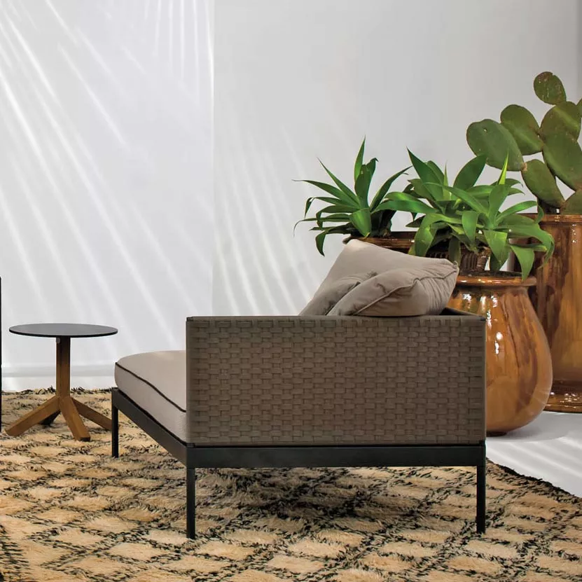 Basket Outdoor Loungemodul 350 von Roda Die historische Kollektion Basket, von Gordon Guillaumier, wurde durch ein modulierbares Loungesofa mit hoher Rückenlehne erweitert. Die BASKET Loungegruppe mit dem hohen Sofa verwandelt jeden Raum sehr raffiniert zu einem fortschrittlichen und komfortablen Sitzbereich. Kollektion BASKET von RODA ist ein Projekt, dass sich durch die extreme formale Einfachheit auszeichnet und besteht aus modulierbaren Sofas und Tischen, die elegant und anspruchsvoll Ihren Innen- und Außenbereich vervollständigen. Die robuste pulverbeschichtete Edelstahlkonstruktion mit der strengen Linie der Rückenlehnen und Sitze wird mit dem absoluten Komfort der Polster verbunden. Loungegruppe BASKET wird mit Edelstahlgestell in Rauch- oder Milchfarbe mit einem grauen oder sandfarbenden Gurtgeflecht gefertigt. Gestell: Edelstahl pulverbeschichtet Rückenlehne Gurtgeflecht: Polyester Auflagefäche für den Sitz: Batyline die Herstellung dieser hochwertigen Möbel erfolgt in erstklassiger Qualität UV-, witterungs- und farbbeständig leicht zu reinigen Maße: (B × T × H) 90 × 90 × 67 (28/11/39) cm