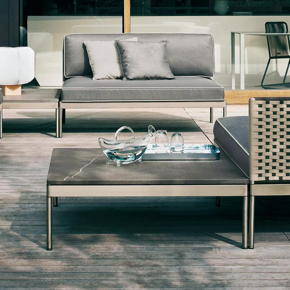 Basket Outdoor Loungetisch 355 von Roda Die historische Kollektion Basket, von Gordon Guillaumier, wurde durch ein modulierbares Loungesofa mit hoher Rückenlehne erweitert. Die BASKET Loungegruppe mit dem hohen Sofa verwandelt jeden Raum sehr raffiniert zu einem fortschrittlichen und komfortablen Sitzbereich. Kollektion BASKET von RODA ist ein Projekt, dass sich durch die extreme formale Einfachheit auszeichnet und besteht aus modulierbaren Sofas und Tischen, die elegant und anspruchsvoll Ihren Innen- und Außenbereich vervollständigen. Die robuste pulverbeschichtete Edelstahlkonstruktion mit der strengen Linie der Rückenlehnen und Sitze wird mit dem absoluten Komfort der Polster verbunden. Loungegruppe BASKET wird mit Edelstahlgestell in Rauch- oder Milchfarbe mit einem grauen oder sandfarbenden Gurtgeflecht gefertigt. Gestell: Edelstahl pulverbeschichtet Tischplatte: HPL oder Stein die Herstellung dieser hochwertigen Möbel erfolgt in erstklassiger Qualität UV-, witterungs- und farbbeständig leicht zu reinigen Maße: (B × T × H) 135 × 90 × 30 cm
