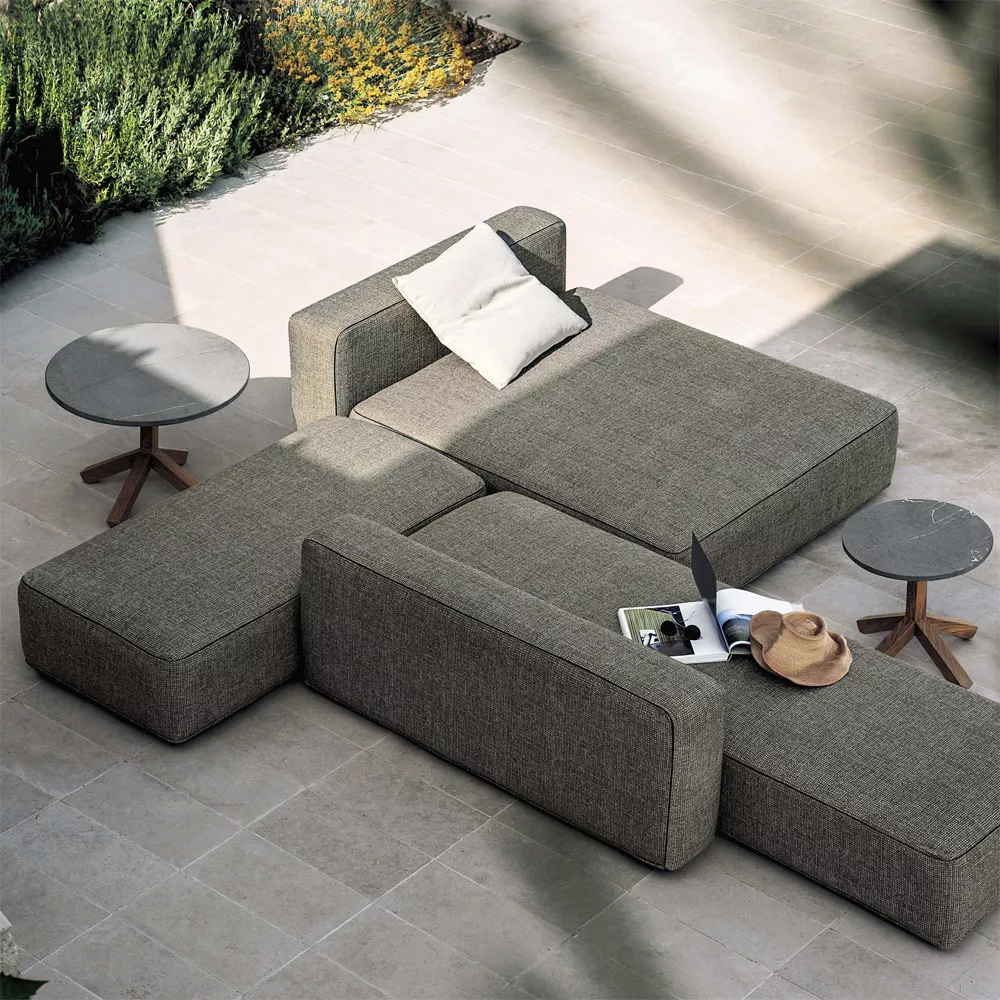 Dandy Outdoor Loungemodul / Recamiere 001 von Roda Schon immer waren gepolsterte Sofas ein Beispiel italienischer Exzellenz. RODA erneuert den Begriff vom Sofa mit der Einführung des ersten ‘total outdoor’ gepolsterten Sofas. Die Haltbarkeit einer Polsterung gegen Wettereinflüsse steht meistens im Widerspruch zu Bequemlichkeit und Schönheit. RODA löst diese Schwierigkeit dank der Verwendung von 3 unterschiedlichen Polyurethanen, die vereint in einem 3D Netz ein „Luftkissen“ bilden. Die Polsterung wird von widerstandsfähigen Elastikgurten an einer leichten Struktur befestigt. Diese Struktur besteht aus Aluminium und Edelstahl 304 Kleinteilen und ist mit einem Polyesterlack überzogen, um Haltbarkeit zu gewährleisten. Dank der verstellbaren Füßen, ist es möglich das Sofa auf jede Oberfläche zu stellen. Die abziehbare DANDY Überzüge werden mit unsichtbaren Klettstreifen an der Struktur befestigt. Die Roda Dendy Outdoor Kollektion von Rodolfo Dordoni verwandelt jeden Raum sehr raffiniert zu einem fortschrittlichen und komfortablen Sitzbereich. Das 3D-Netz Grey um das Dränage-Polster verleiht dem Produkt einen angenehmen, kompletten Look, auch ohne Polsterbezug. Kollektion Dandy von RODA ist ein Projekt, dass sich durch die formale Einfachheit auszeichnet und besteht aus modulierbaren Sofas und Tischen, die elegant und anspruchsvoll Ihren Innen- und Außenbereich vervollständigen. Die robuste pulverbeschichtete Aluminiumkonstruktion mit der strengen Linie der Rückenlehnen und Sitze wird mit dem absoluten Komfort der Polster verbunden. Gestell: Aluminium pulverbeschichtet die Herstellung dieser hochwertigen Möbel erfolgt in erstklassiger Qualität UV-, witterungs- und farbbeständig leicht zu reinigen Maße: (B × T × H) 225/247 × 97 × 36/44/60 cm