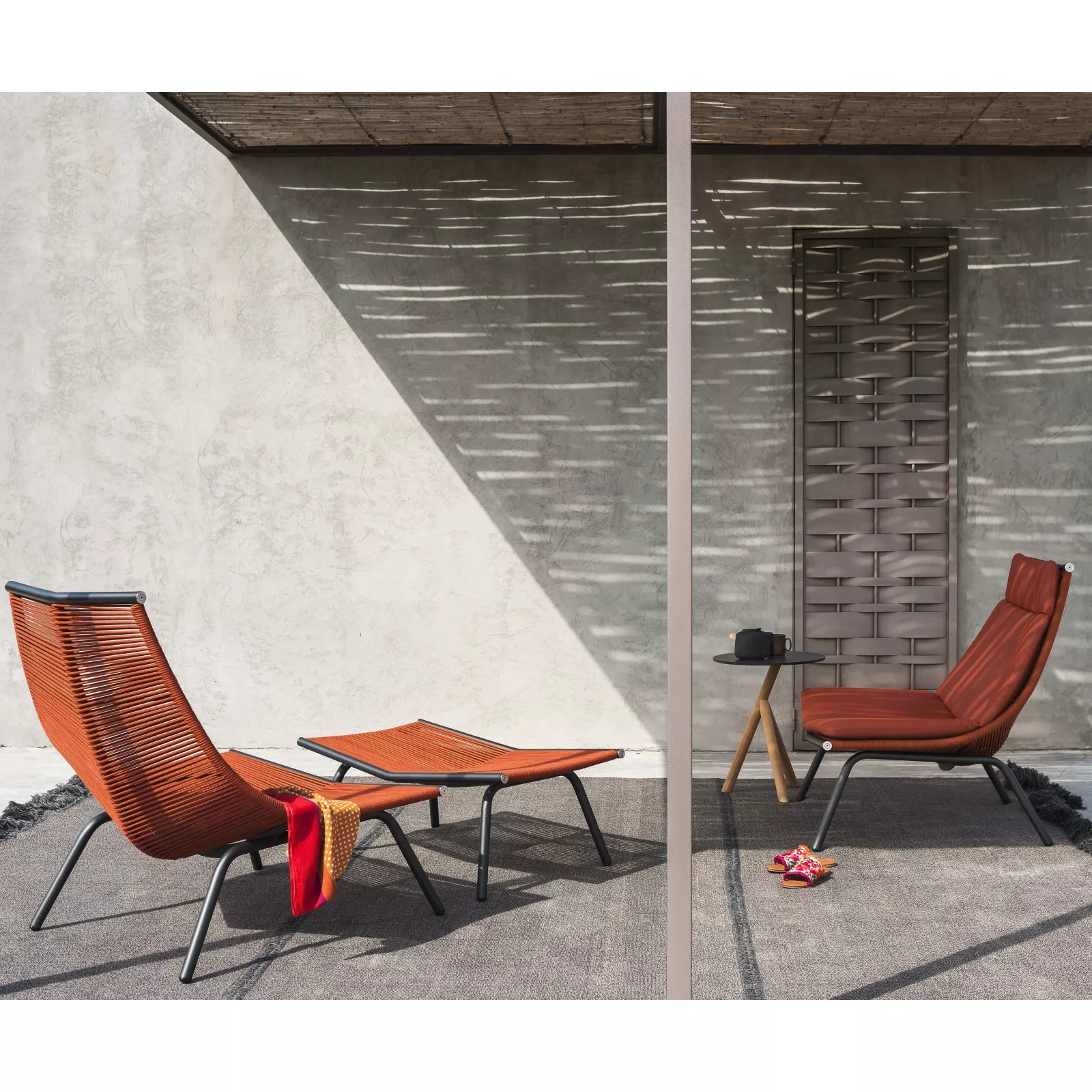 Die Kollektion besteht aus Gartenhockern, Loungesofas, Loungesesseln und Loungestühlen, die alle ein einzigartiges Design aufweisen und Komfort mit Stil verbinden. Die Möbel bestehen aus robustem Edelstahl, der mit strapazierfähigem Polyester- oder Acrylgarn bespannt ist. Diese Fäden bilden eine stabile und dennoch flexible Basis, die die bequemen Sitz- und Rückenkissen optimal stützt.