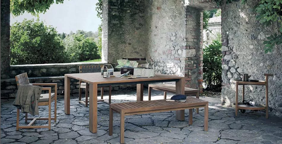 Die Kollektion umfasst Sofas, Hocker, Couchtische, Bänke, Stühle, Liegen und eine Sonnenliege mit Rädern und Teakholzleiste für Handtücher.